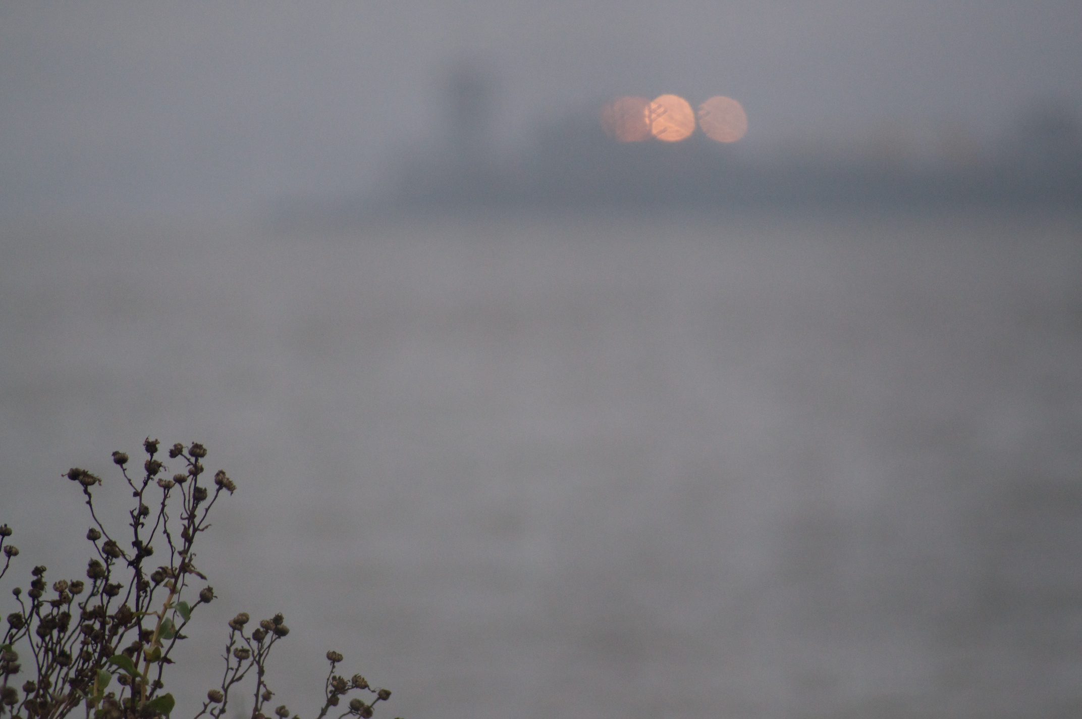 I had no coat, and it was freezing- my hands were shaking and contributing to my focusing problems. So I got in the car and made the loop to turn around when I saw a tugboat! That means a ship- another photo opportunity! So, shivering, I got out and snapped a few of the ship through the fog. Interesting results- all shots today are straight out of camera.