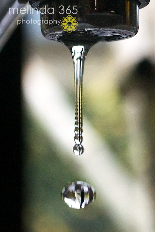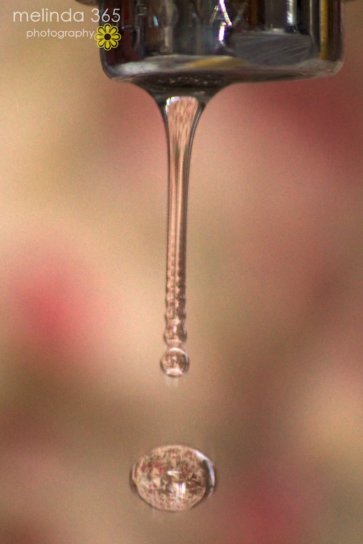 Today I tried all different ways to photograph water dripping out of my kitchen faucet. I’ve been inspired by all the beautiful macro work showcased on Clickin Moms- and have carefully read directions on how to achieve this with a macro lens and speedlight (don’t have either…)- and then how to do it with the 70-300mm zoom- YAY! I have that!  What I don’t have, I discovered, is a working tripod other than my gorillapod (I’ve been carefully storing my father’s ancient tripod since 1982 and then discovered today that it is broken). There is a lot of camera shake with the zoom, so a tripod helps.  I discovered that  I could wrap the gorilla pod around a kitchen chair, manually focus, and then click- many, many  clicks!  I still think that I never achieved proper focus- but I got better as the day wore on (and the light waned, alas).  I tried to get cool color effects by placing a pillowcase behind the faucet; I need to find something brighter next time.  I also tried using my kit lens at 55mm (handheld, with no pillowcase)- and I like that one better!  I’m not thrilled with either photo- but- BIG SIGH- it is all a process . . .