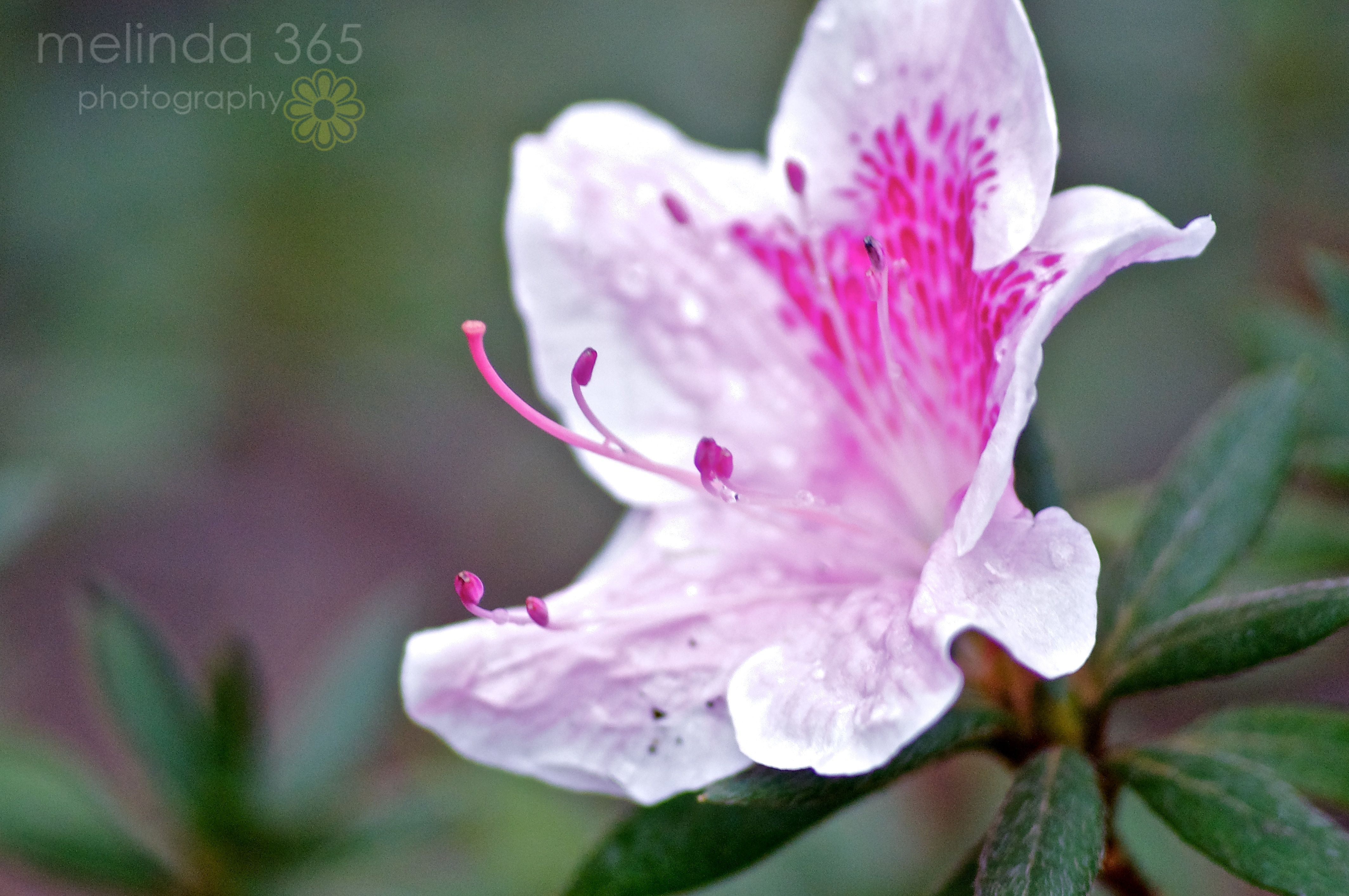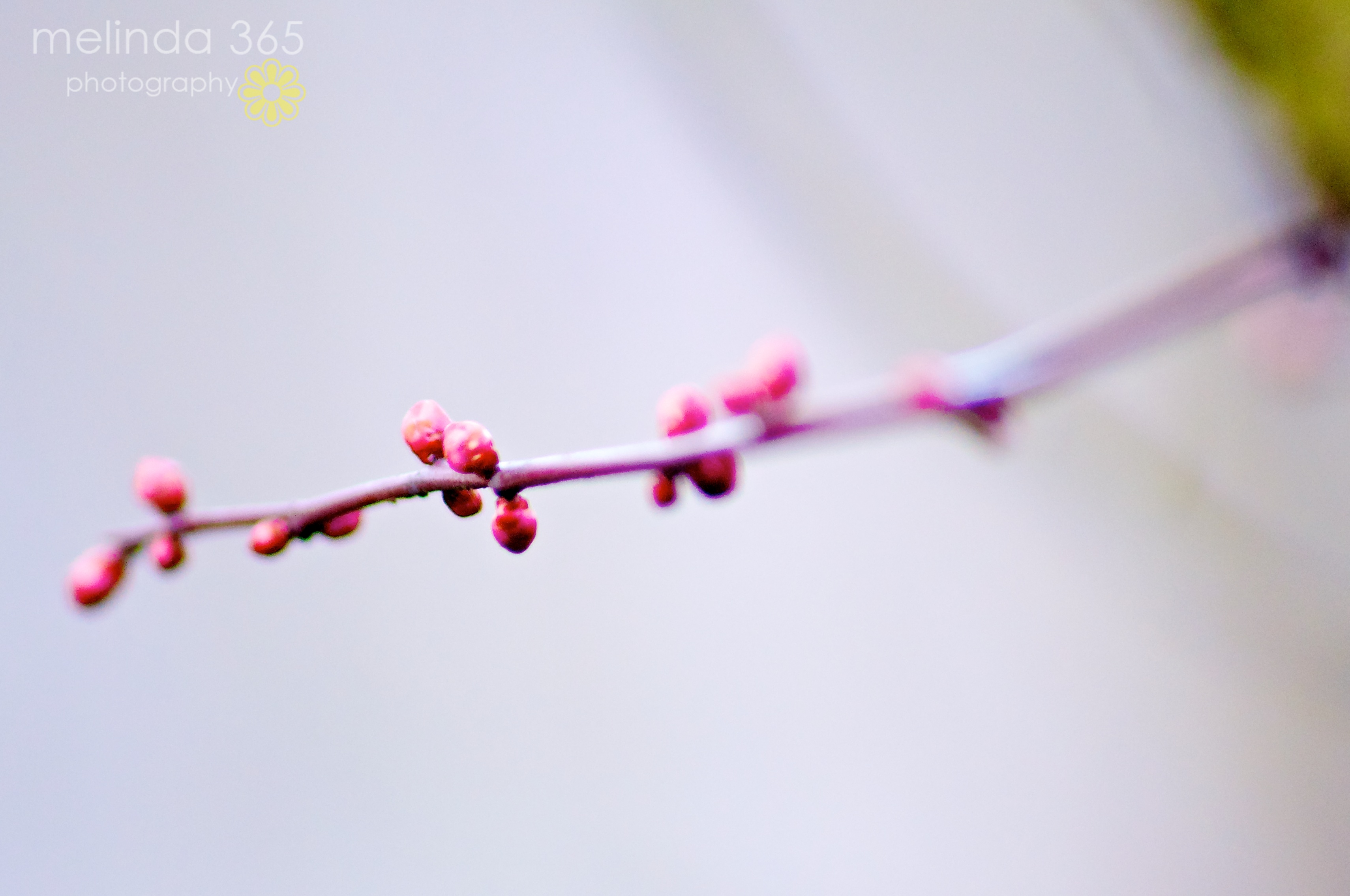 It’s another foggy, dreary day here- not really a surprise for January, but I decided to look around our yard for signs of Spring. I found 3 azalea blooms AND some tiny red buds on our plum tree. I fought with used my 70-300mm lens in macro at 300mm and ended up with a very shallow depth of field and very over-exposed images. I adjusted exposure and anything else I could adjust in Aperture 3 and these are the results.