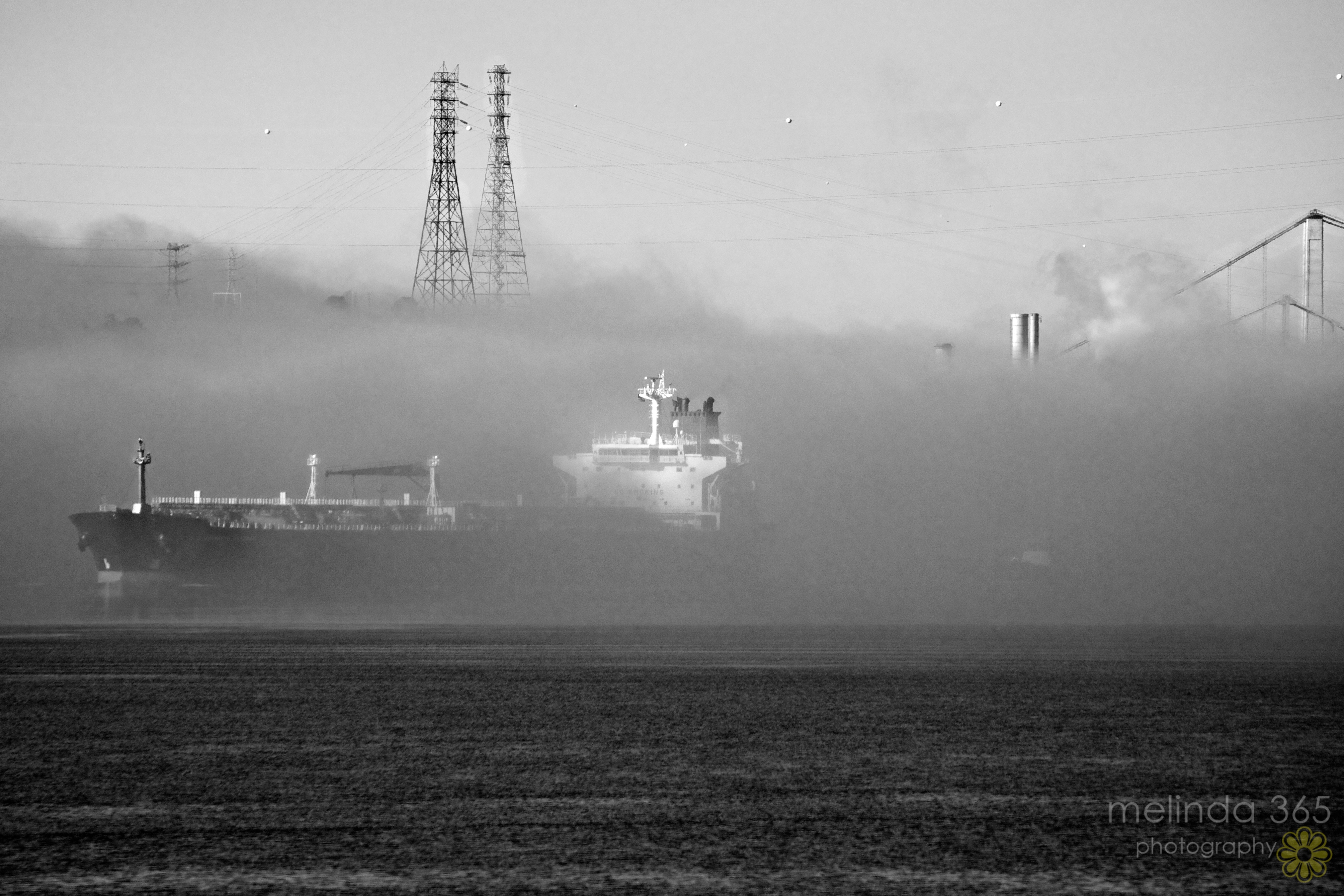 When I reached home, I grabbed my camera and headed back out in search of photo-worthy fog- not too easy to find!  I drove around our now sunny neighborhood hills looking for view shots and eventually found myself down by the water, where I snapped this image of a ship emerging from the fog.