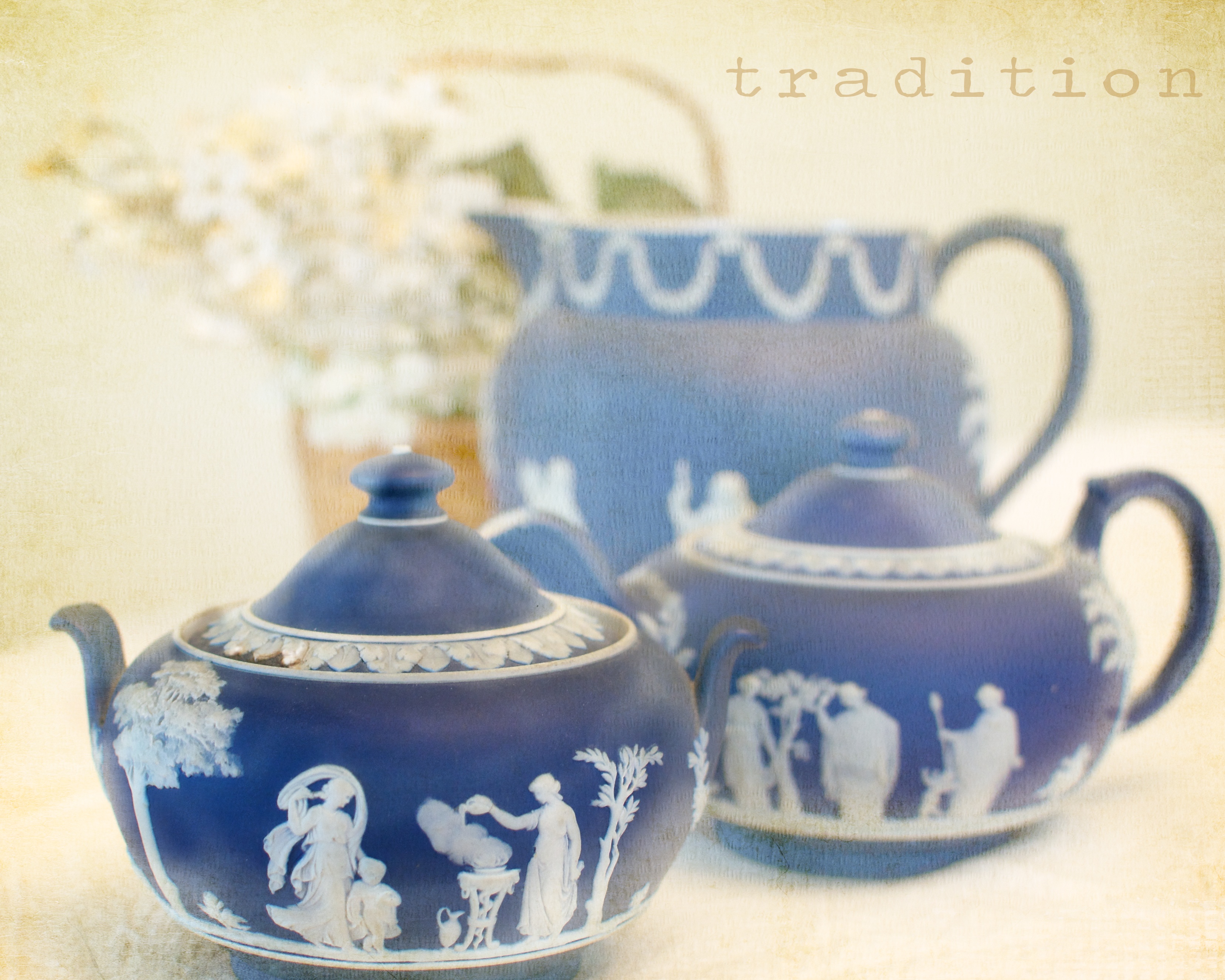 When I started this project, I considered that it would be a good way to document some of the family heirlooms, so that my children would remember what they were and which family member had owned them. So here is a photo of my mother’s mother’s Wedgewood.  It may even have been my great-grandmother’s- I am not sure.  Anyway, it belonged to my grandmother and my mother- and now it is ours. I’ve always thought it was beautiful, even though one piece is cracked.