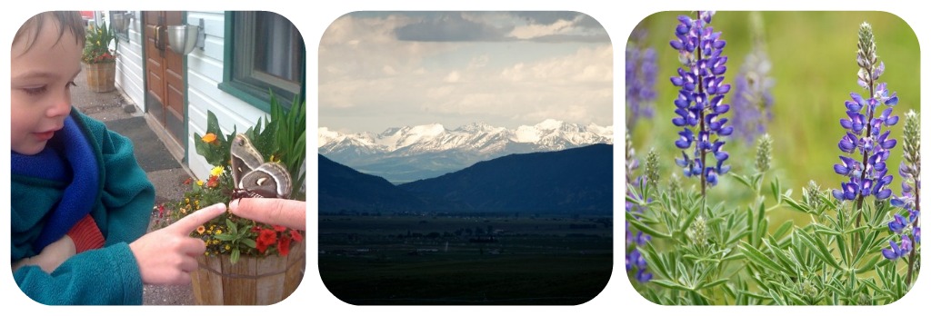 Photo collage: Miles, post-swimming, examining a gorgeous moth that Justin found, a small segment of the amazing panoramic view from our cottage, and some of the beautiful lupin in the fields outside.