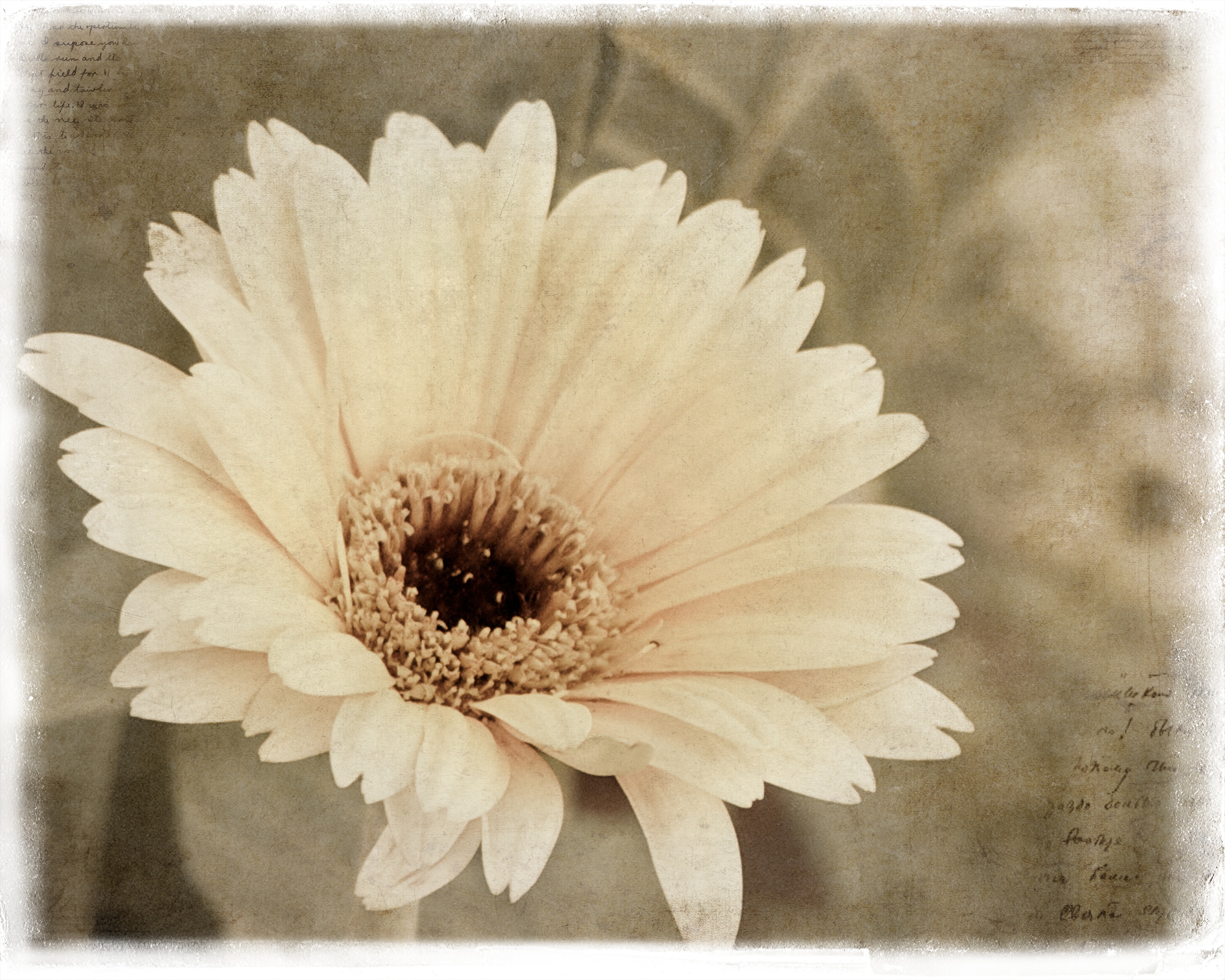 It is Texture Tuesday again!  I knew I wanted to do flowers again- but our flowers are fading fast, and I didn’t have the time or inclination to go out looking today.  I ended up shooting our much photographed Gerbera Daisy and desaturating it in Aperture.  I was going for a faded yellow tone, but ended up desaturating it more in Photoshop, because I didn’t like the green background. Eventually I went for a sepia processing before I added my textures. The assignment today was to use Kim’s aurora texture (the one with the script), and I also added golden and february magic edges.