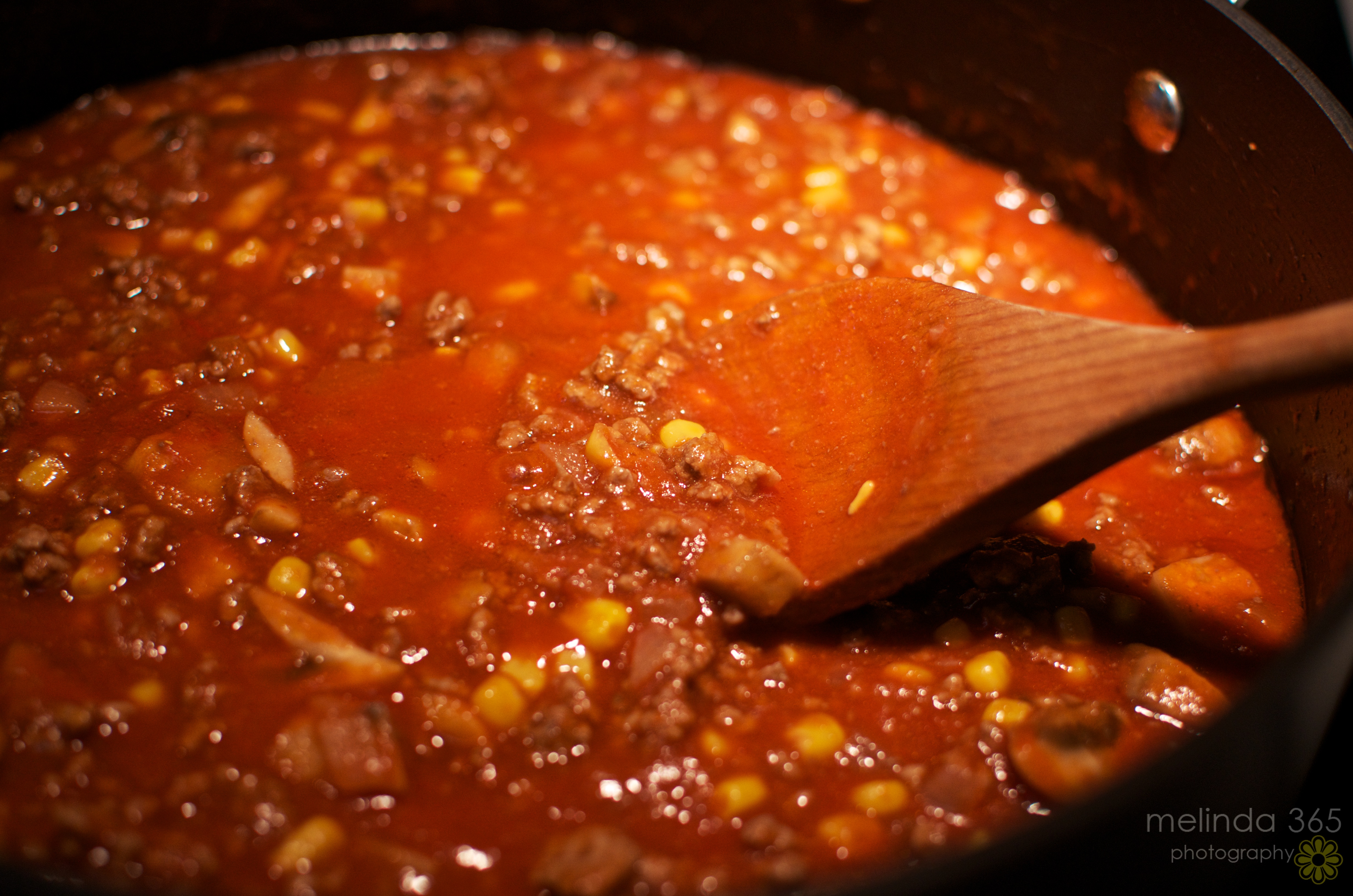 It was basically hamburger and onion and tomato soup (not sauce)- with the addition of canned corn and canned mushrooms- and hunks of cheddar cheese melted into it.  It was supposed to be served with noodles- but we never had it that way.  The crowning touch was baking powder biscuits placed on top! Oh my!