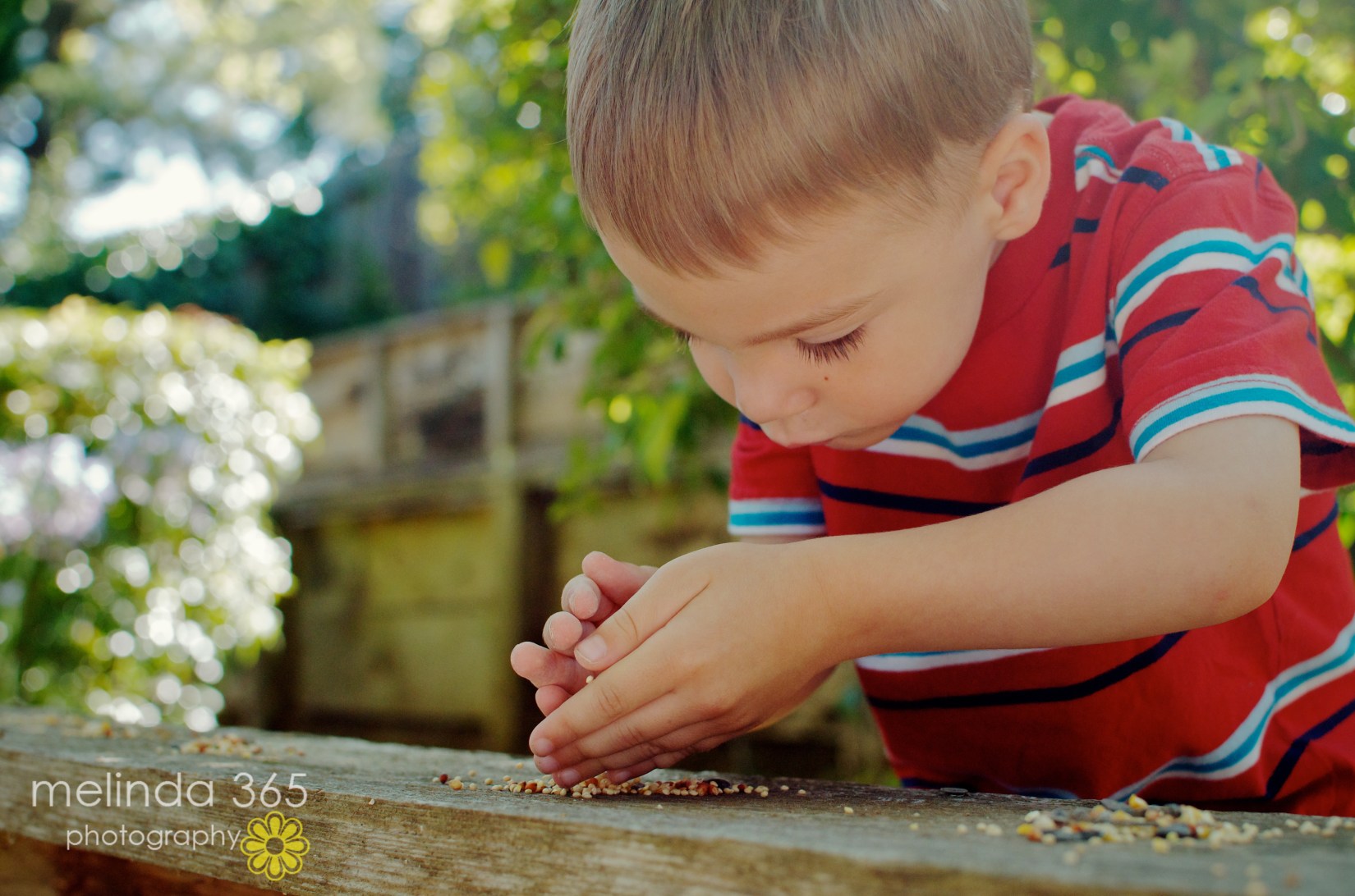 Sadly, we haven’t had any pets for a few years, and Miles is used to feeding his two golden retrievers at home. So, his pet feeding job at Grandma and Papa’s house is now putting out birdseed for the birds that come to our yard. He is very careful and precise with this new responsibility.