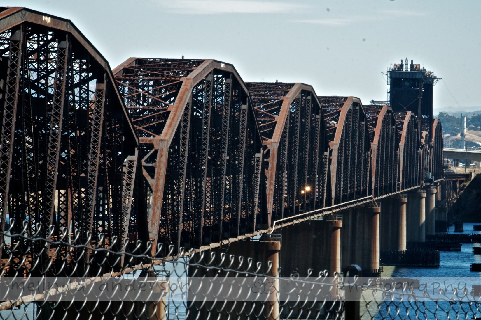Searching for photo ops, my husband and I drove around town today and ended up at Vista Point overlooking the Benicia Bridge. I was photographing the railroad bridge when a train chugged over, giving the photo a bit of a focal point.