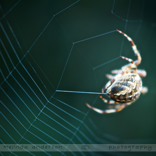 I found this rather large spider working hard in my garden this morning (with two more nearby!).  I didn’t really get the shot I wanted (a closeup of a spider spinning a web- all in focus).  When I increased the depth of field (closing down the aperture) on later shots, she was moving too fast for the slower shutter speed required. So, I settled for the shallow depth of field. BTW, this photo was not cropped, other than making it square (yes, I was THAT CLOSE!).
