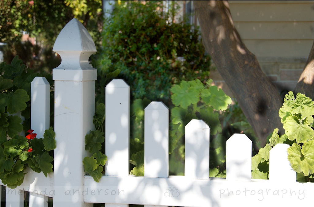 I spotted this white picket fence on the way home from my physical therapy appointment (carpal tunnel, not- hopefully- photography related), pulled over and got this shot.  This is actually more than one shot, because of the deep shade.  I had to blend two photographs in Photoshop in order to get enough detail in both foreground and background.