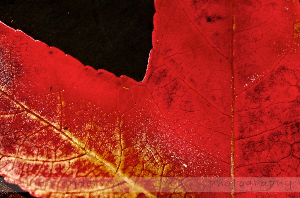 1. Well, envy no more! This is as gorgeous a colored fall leaf as I have ever seen. The composition is unique and effective and the yellow veins draw the eye and add interest. Very, very nice. Keep those super macros coming!