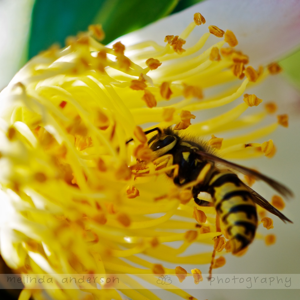 1. Eww! Yellow jackets. Watch out for those stingers. I’m proud of you. Despite the danger, you captured a beautiful shot and how nice that the creature matches the stamens (pistils?) Interesting composition and angle and I like the shallow depth of field; the business end of that wasp is out of focus and the eye in perfect focus. Very dramatic.