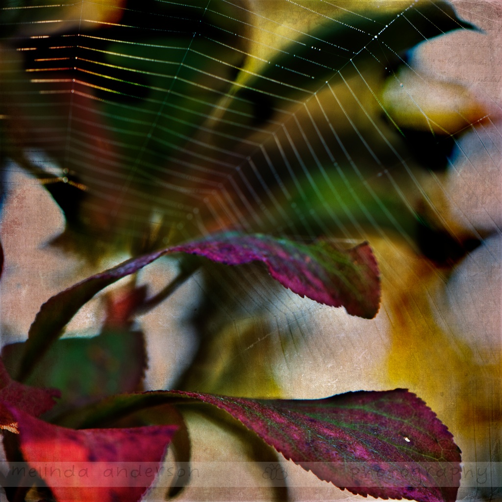 The colors in the web are what attracted me to this photo.  I was trying to quickly find some colored leaves this morning for a macro shot, but noticed the web. I added a texture because. . .well, the photo needed rescuing!  There were blown highlights I couldn’t recover- so I filled them in with texture.  I love Photoshop!