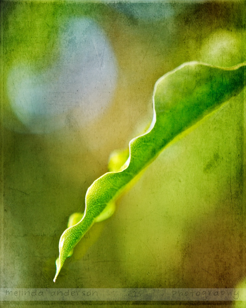 This is one of those uninspired days. Thank goodness for Texture Tuesday and for Flickr topics- otherwise I would be even blanker than I am right now! One of the ODC topics this week is Going Green, so I took some photos of the green leaves in our yard and textured them with one layer of Kim Klassen’s cool grunge and another layer of peacock.