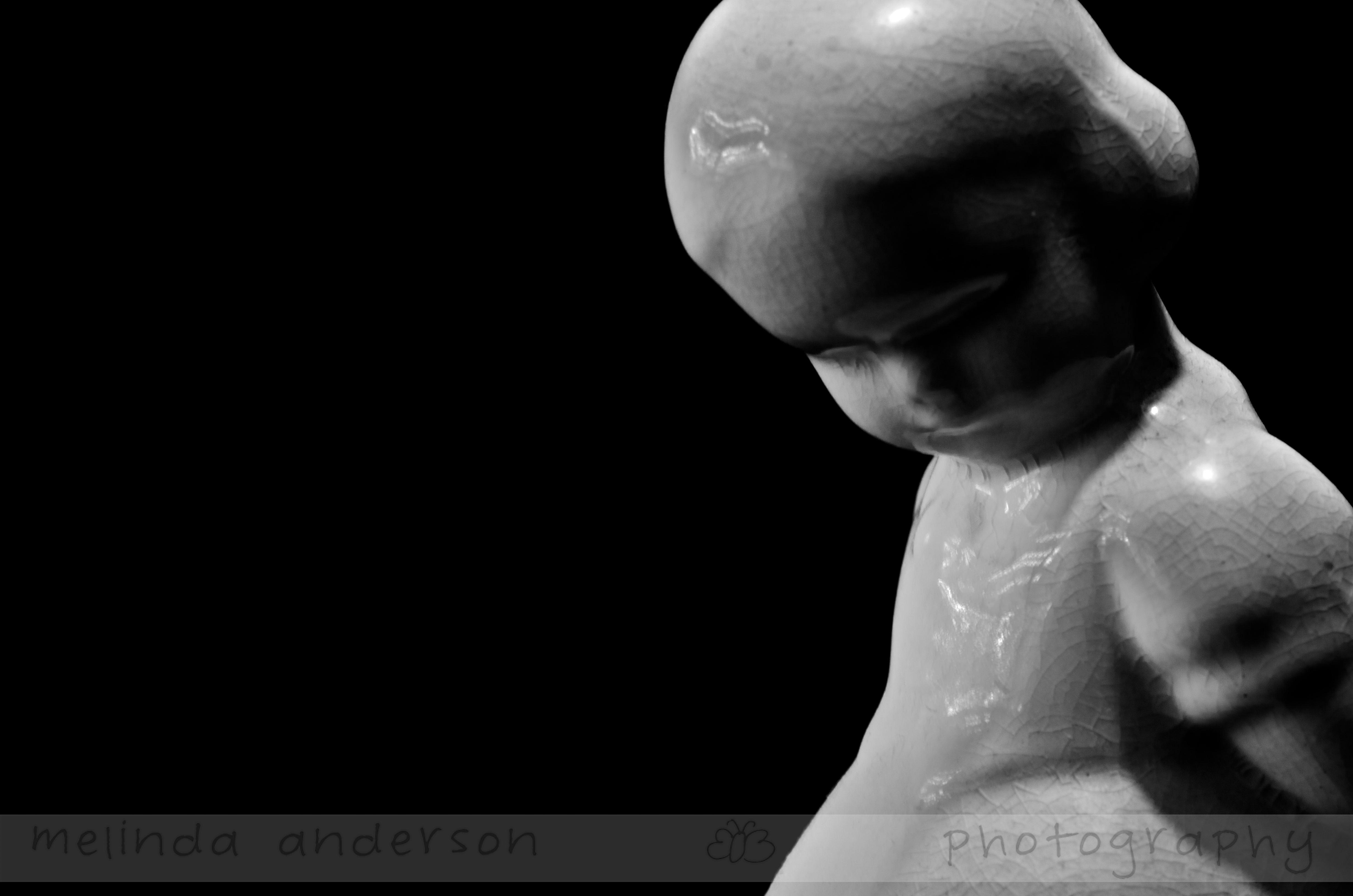 This sweet figurine/vase was my mother’s, and I’ve always loved it. I used it for today’s Flickr group challenge- Hard Light. I wasn’t sure how to go about it, but placed her under my kitchen table light, which cast harsh shadows. I then processed the image in black and white (although the piece is already white) to emphasize the contrast between light and dark.