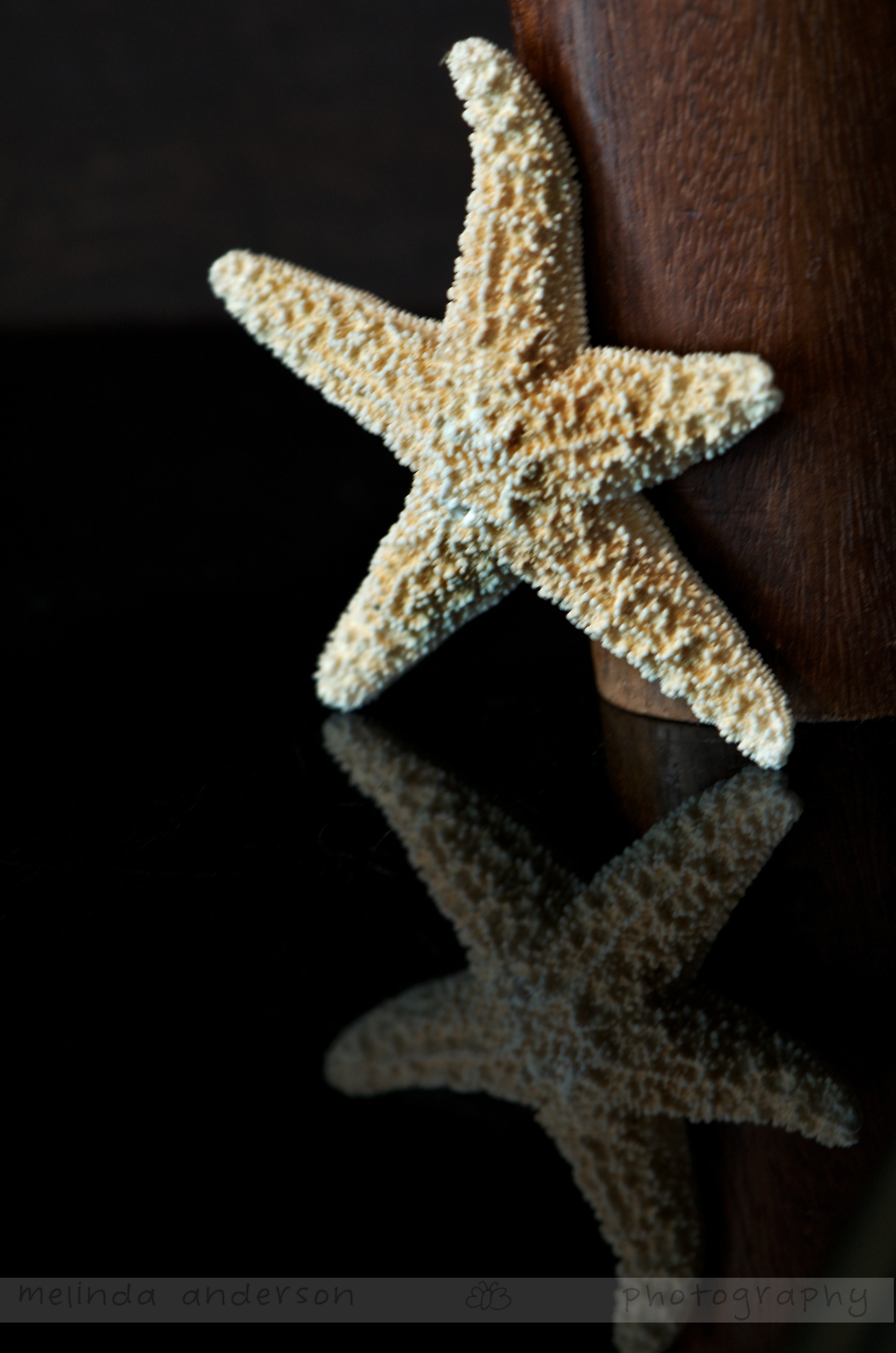 So, the topic is radiating lines, and I pretty much went for an obvious choice. The challenge for me was to get the photo to look like what my eyes were seeing.  I had a difficult time getting the reflection (which was very clear in real life) to show up without blowing out the highlights in the actual starfish.  I ended up going with an exposure somewhere in between, and increasing contrast in the top starfish in Aperture and Photoshop. Still, the shoot and processing took only about fifteen minutes.