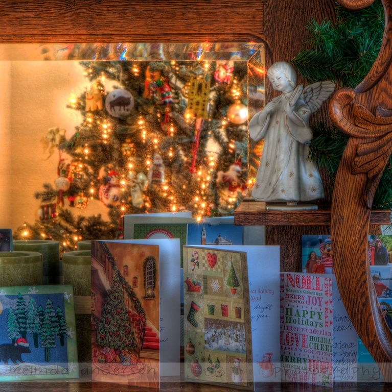 This was one of those frustrating photography days. The theme is through the looking glass, referring to using a door, window, or mirror as a frame.  My plan was to take a photo of my Christmas tree reflected in the mirror of my hutch- simple, right? I wanted to use a small aperture, so that the lights would show up as starbursts.  I used my tripod with a long exposure and focused on the tree. No starbursts! I tried all different exposures and focus points and would run upstairs to check my focus after every few photos. Nothing looked right, and I finally realized that the soft focus of the Christmas cards in front were detracting from the photo. I decided at that point to forget about the starbursts and go for an HDR photo.  I focused on the cards and took a series of bracketed shots.  After deciding on the set I liked, I edited them in Photomatix for my HDR processing- and discovered faint starbursts. Go figure!
