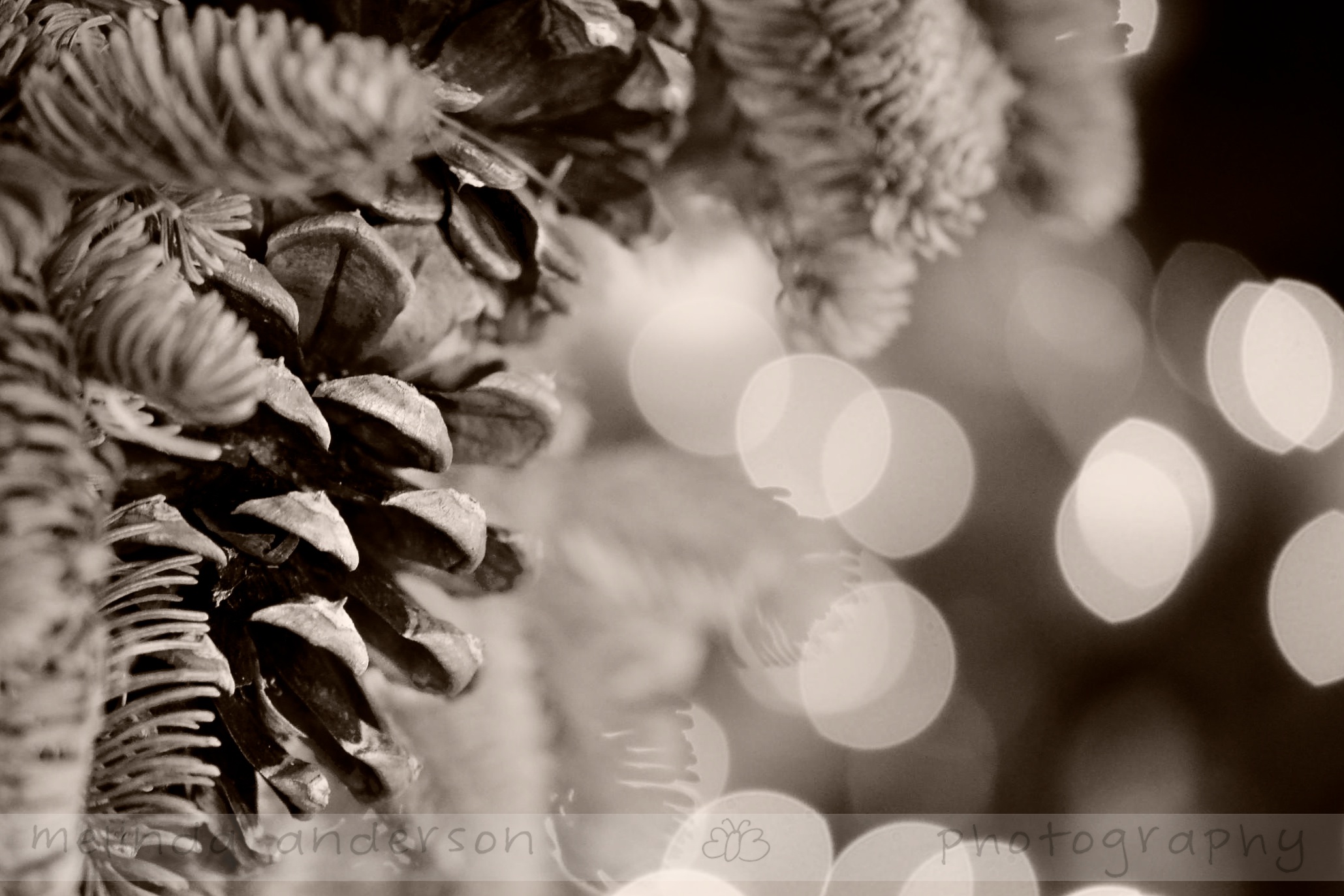 Today’s theme is symbol, and I chose to photograph a detail of the wreath (symbol of the coming of Christ) on our front door. I left the door open, so that I could get some Christmas tree light bokeh in the background.  For variation, I used a used a brown toned black and white conversion.