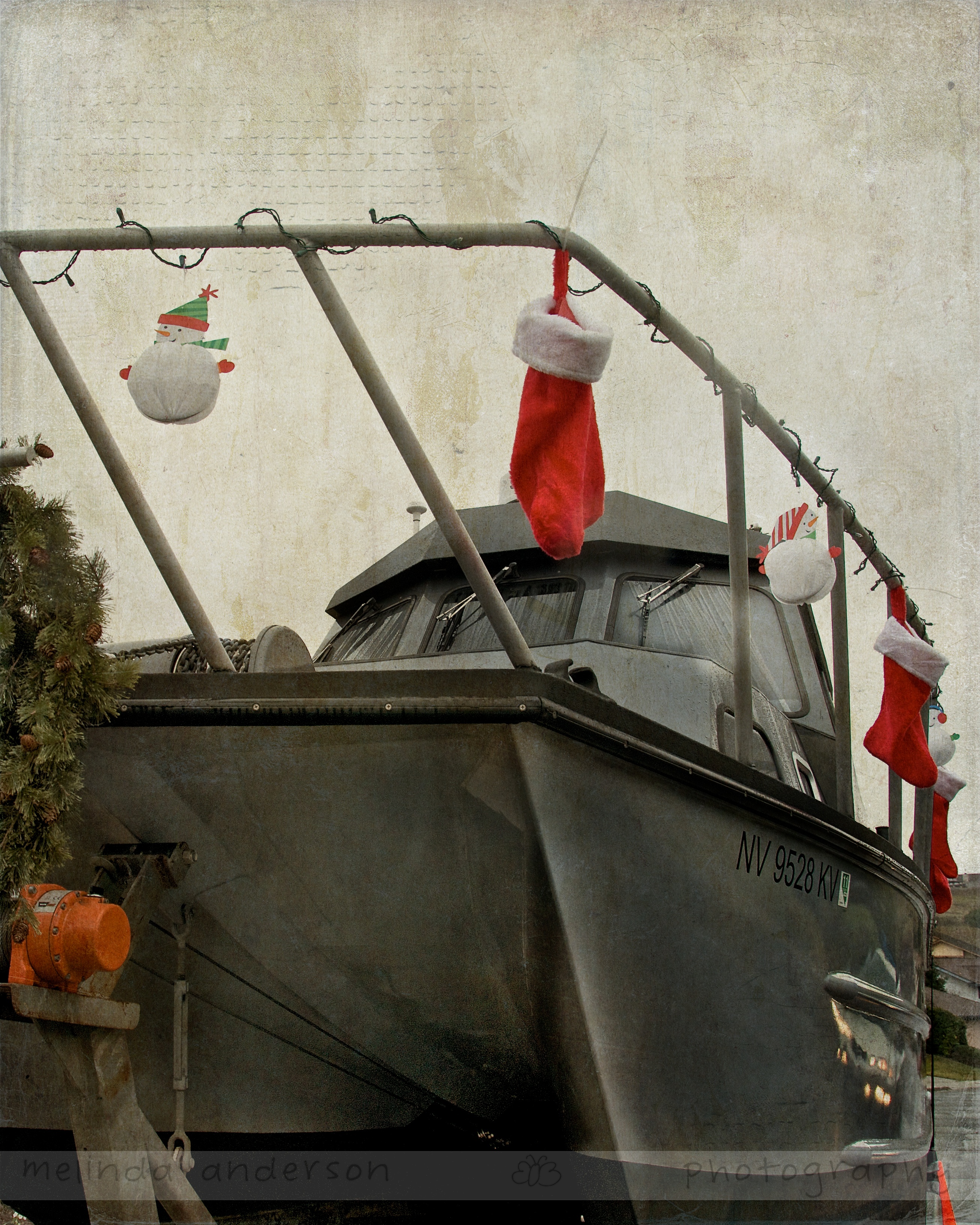1. This is very whimsical. I love the angle you shot it from and the textures. It looks vintage. I like the colorful contrast of the Xmas decorations with the dreariness of the day and if you hadn’t mentioned htat the boat is your neighbor’s, I would have thought it was at the dock. NIce shot.