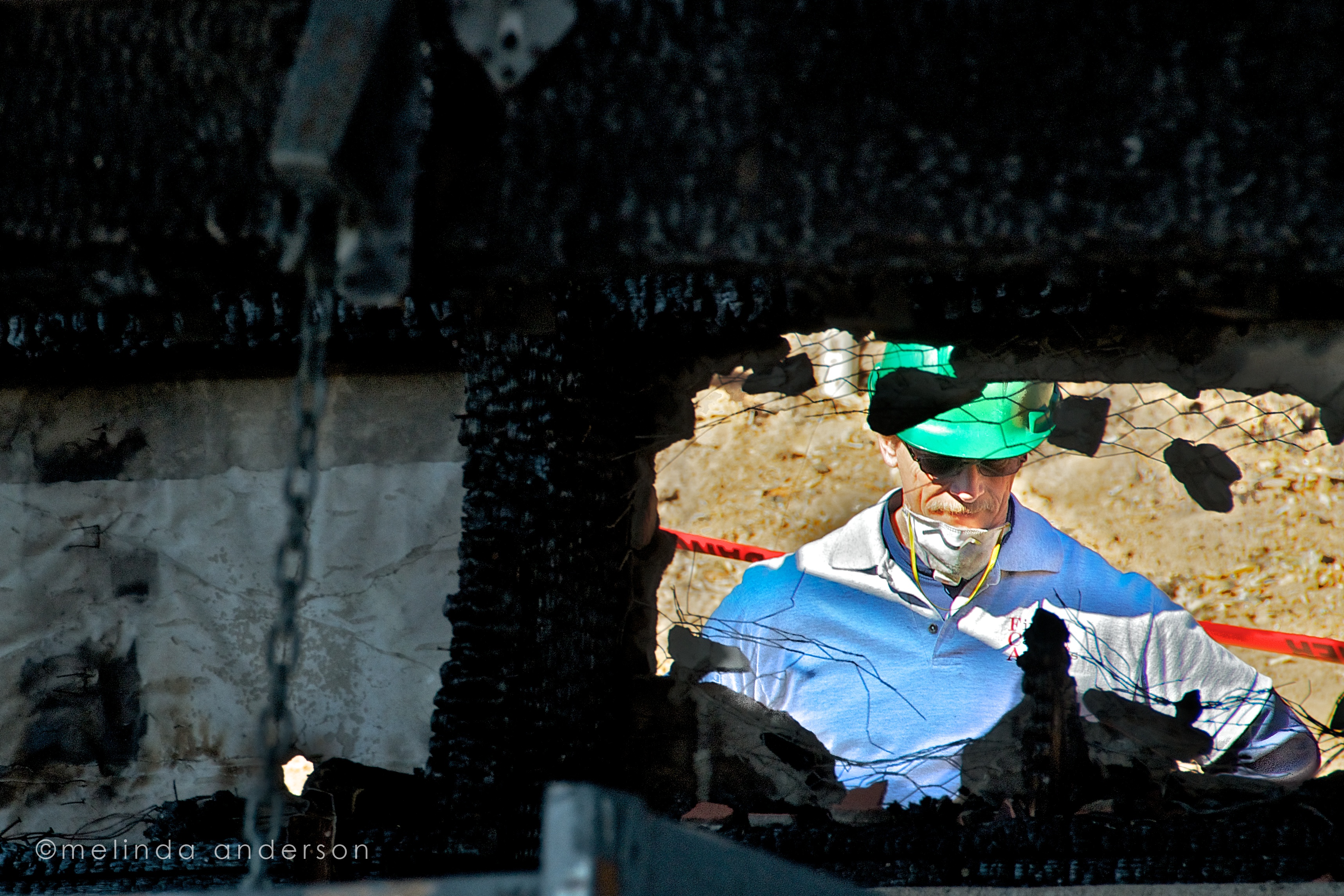 Coincidentally, the topic of the day is “environmental portrait”, a portrait of someone in an environment that tells you something about the person. I didn’t have the courage to ask one of the workers to pose, but (sneakily!) took this quick photo of a fire investigator through a burned out building.