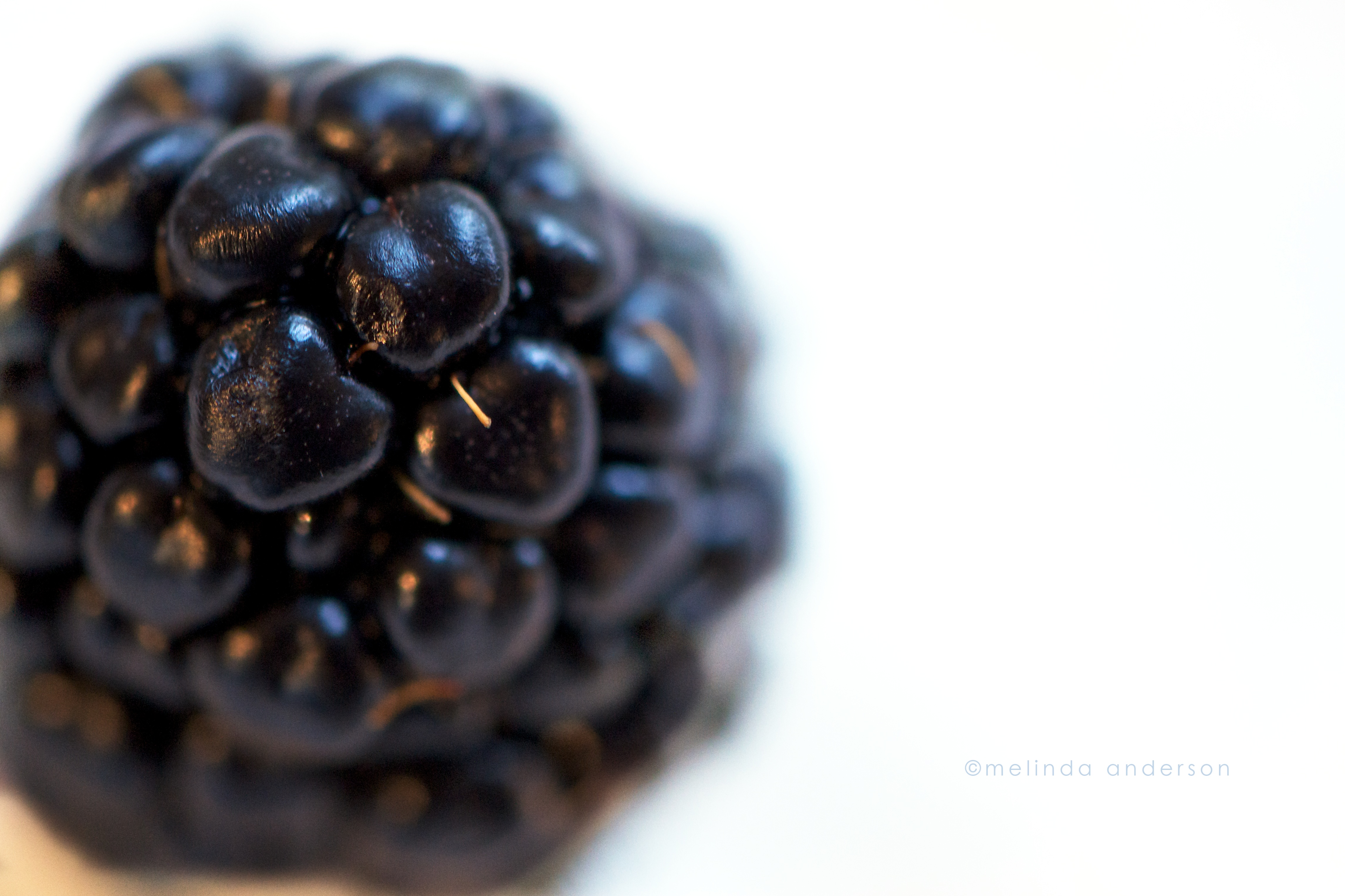 I’m back on track with Macro Monday. This was an easy one- the blackberry left in the bowl. The only decision beyond white balance was depth of field. I chose a shallow DOF for this one; only the top is in focus. Oh- and another choice I made was to go with a high ISO, allowing any grain present after noise reduction to just BE.