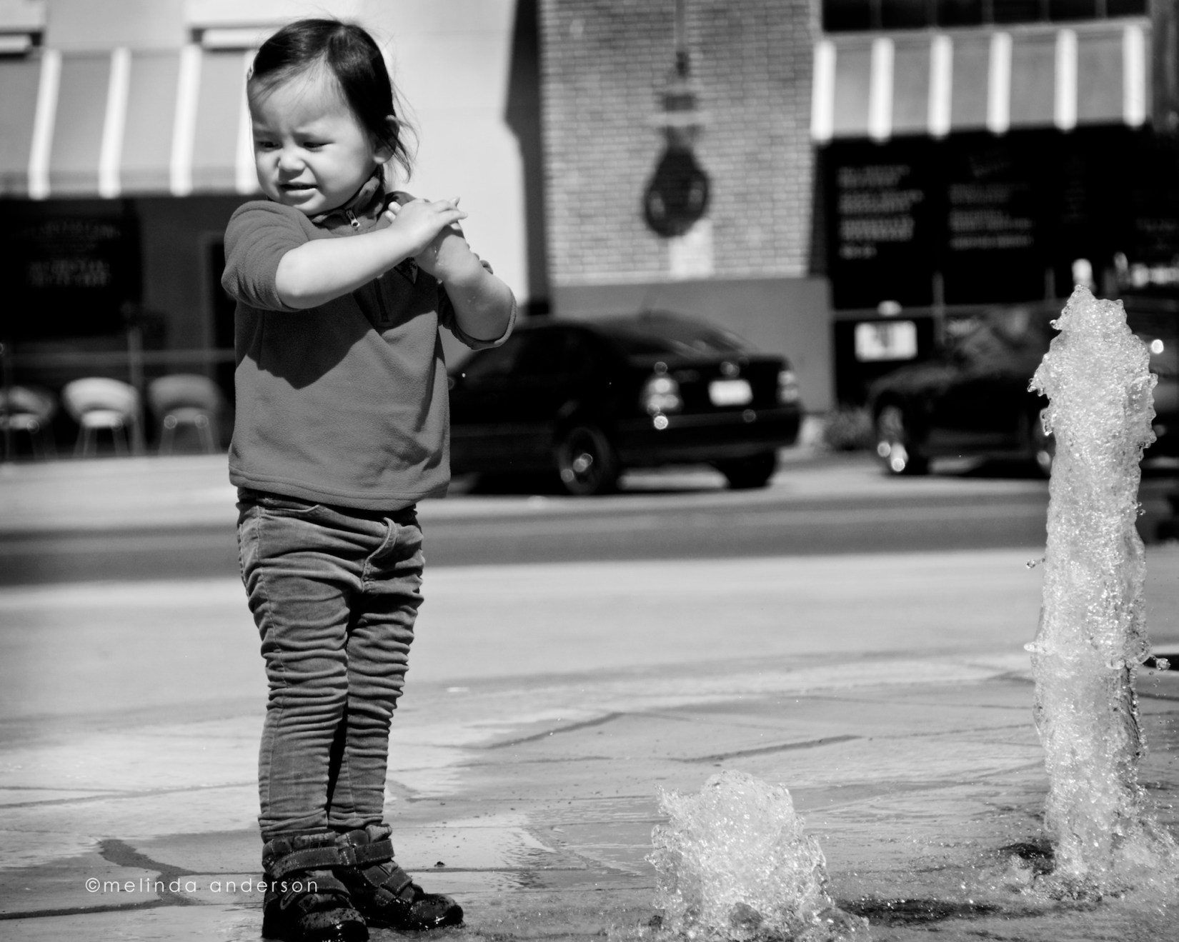 1. Nice group of photos. I especially like the fence shots, both versions. And the shot of the little girl is intriguing with the fountains spewing up. They make a nice counterpoint for her.