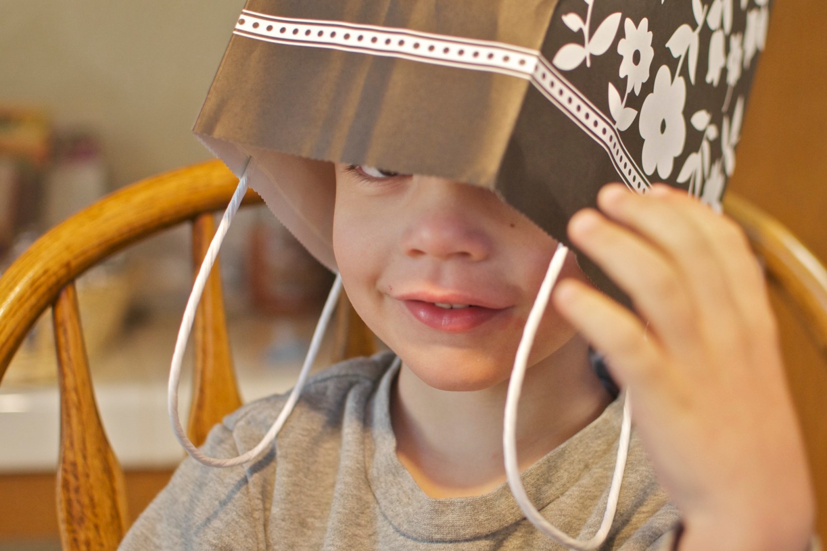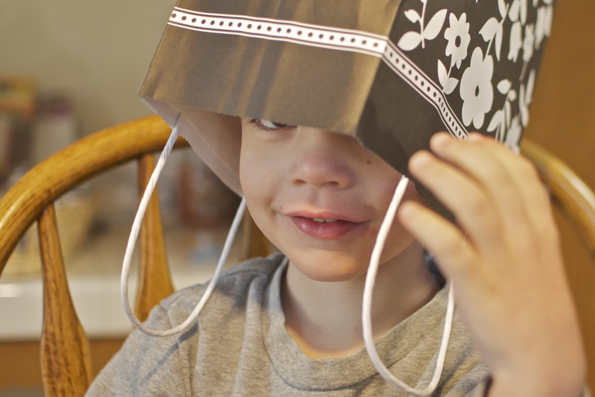 Here is Miles playing with a gift bag after checking out his new clothes.