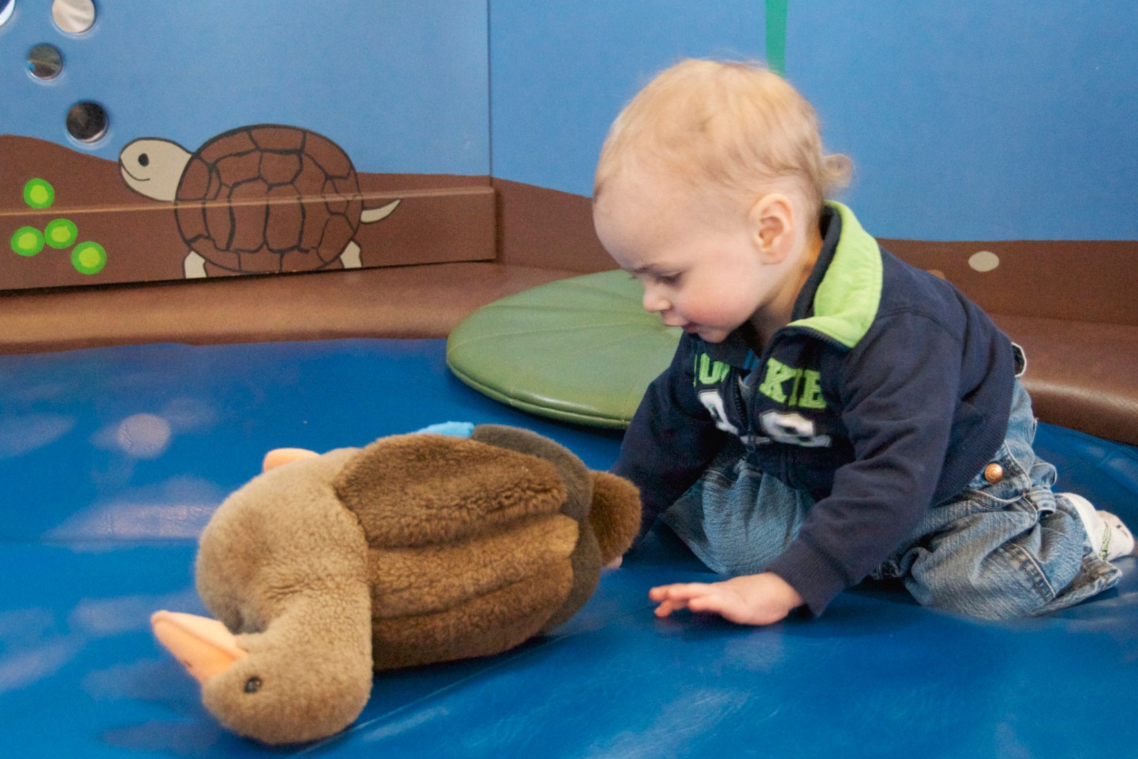 . . . and Henry exploring the bouncy “pond” and meeting a duck!