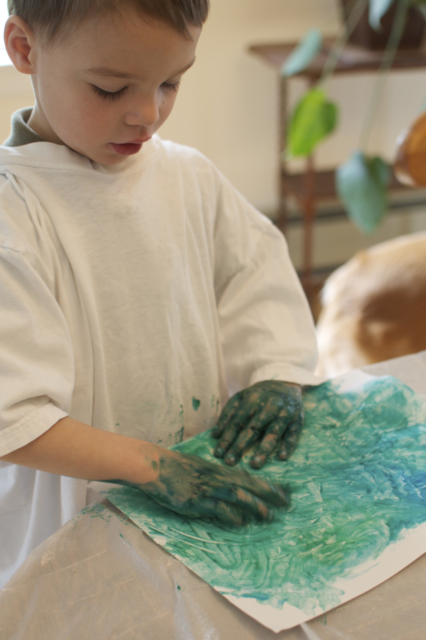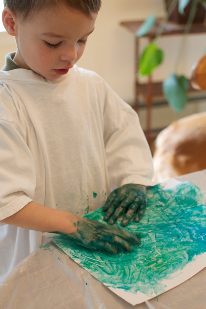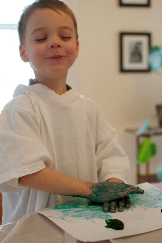 And here he is savoring the first taste of his muffin- while finger-painting!