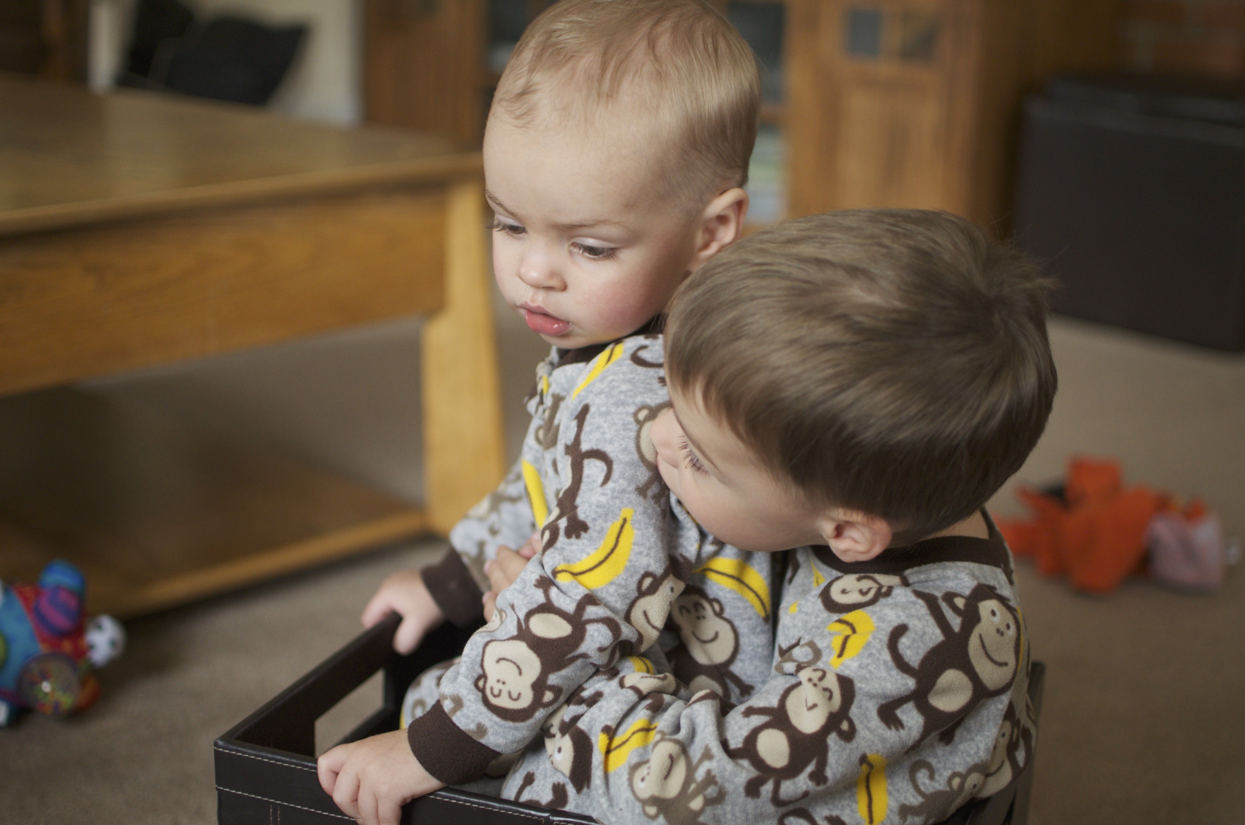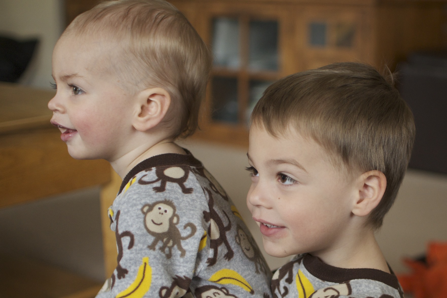 All three shots are nicely composed. I like the first one because it tells a story. The lighting is dramatic and you can see how excited Henry is. The other two are so charming and they show how much Miles adores Henry. And they have really cute pajamas!
