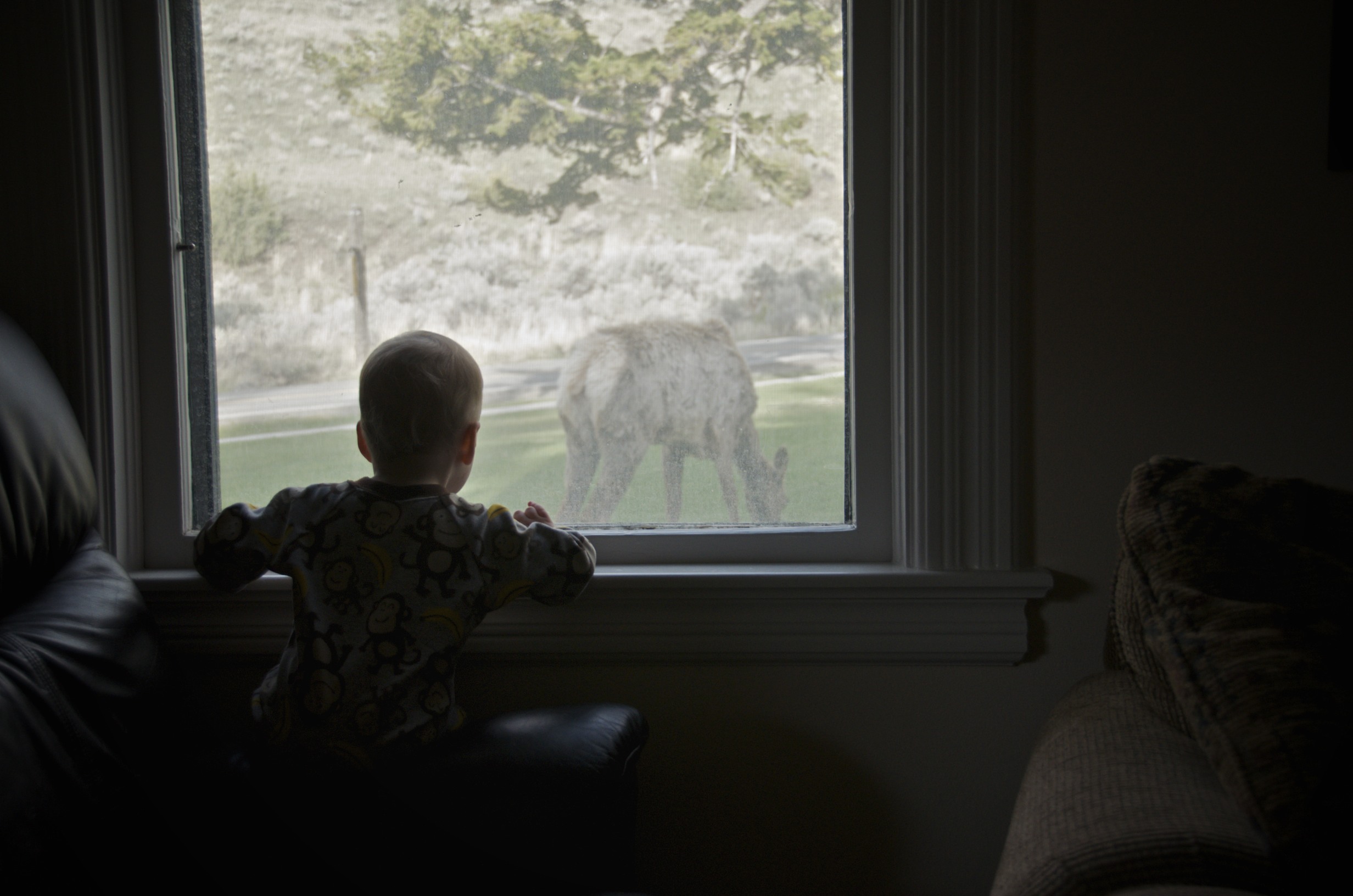 Here is Henry watching an elk out the window- and both boys playing boat.