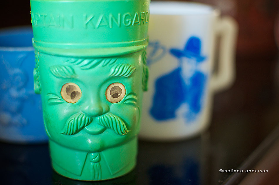 My husband has very few items saved from his childhood, but his Hopalong Cassidy mug and Captain Kangaroo cup are prized possessions. Like most of our family memorabilia, they are housed in the antique dental cabinet in our foyer. The theme today is history, and these cups are definitely part of our family history.