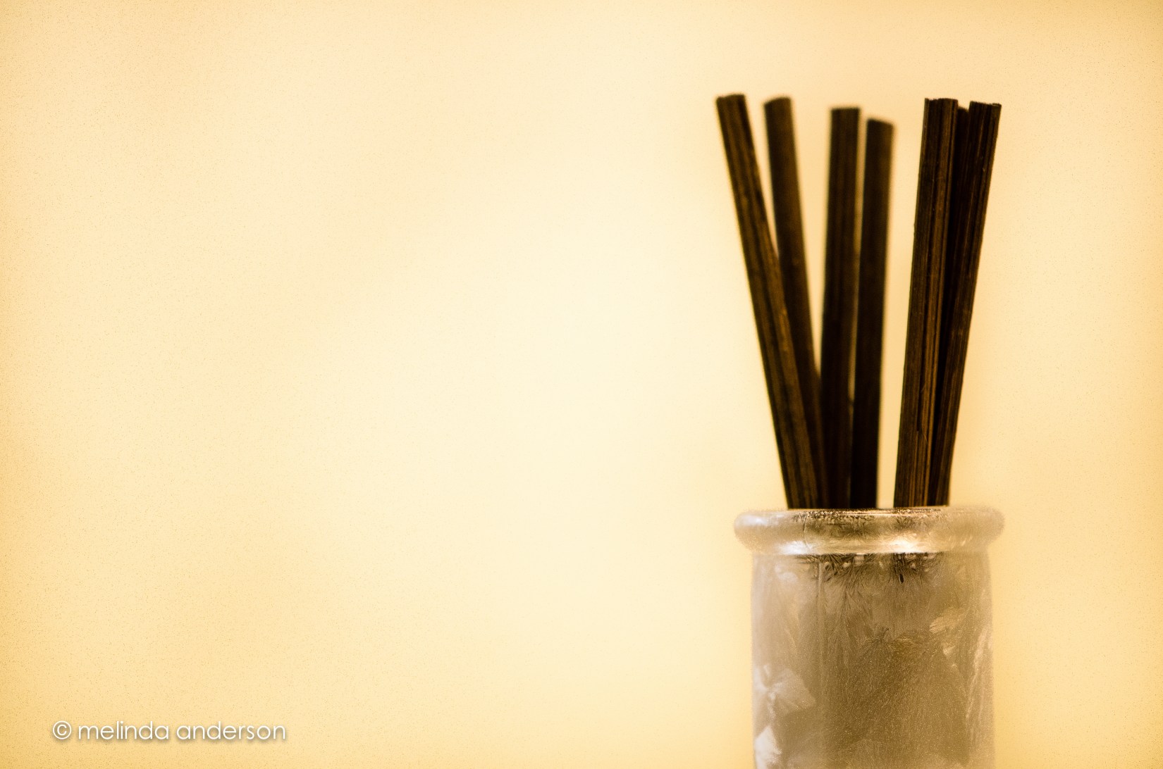 Day 174- Negative Posted on June 22, 2012 by Melinda Today’s topic is negative space. I didn’t really nail the topic here, because there could potentially be more negative space here. I do like the composition however- and the subject, a lovely reed diffuser given to me by my friend, Darlene. Share this: Email a link to a friend (Opens in new window) Email Share on Facebook (Opens in new window) Facebook Share on X (Opens in new window) X Share on Pinterest (Opens in new window) Pinterest Related