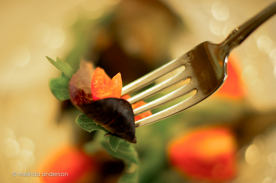 On the table was yesterday’s theme. Photographing myself eating a salad lunch seemed like an easy idea- until I tried it. The tripod was set up in the kitchen from a shoot from last week, so, when I realized I couldn’t hold the camera and the fork AND press the shutter, while keeping it all in focus, I used the tripod. Even so, it was a bit tricky getting the focus right, because I wanted a shallow depth of field.