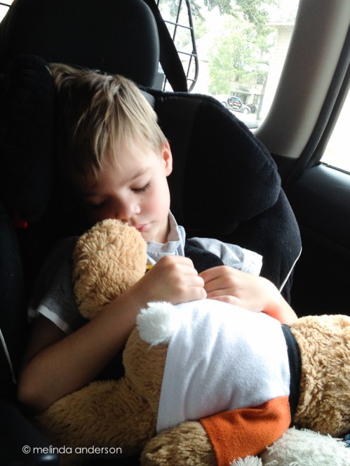 Surprise! Miles, Henry, and, oh yes, Caitlin met me; I’d expected Justin and Miles, but he had to go into work. We went out for coffee, did the grocery shopping, went out to lunch at Miles’s favorite Mexican restaurant in Livingston, and then drove on Yellowstone. Shortly before we arrived at Mammoth, Miles and Henry were both asleep. Miles continued to sleep for 20 minutes in the car while we unloaded the groceries. I snapped this photo with my iPhone- I love the light and shadows on his face.