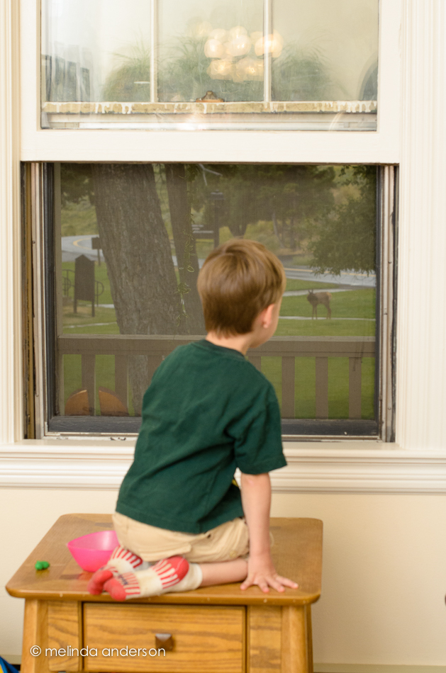 It was a quiet day at home today- outside playtime, Candyland, stories, singing, dancing, coloring. The group of mama and baby elk returned after an almost two week absence, so the boys’ outside time ended abruptly.
