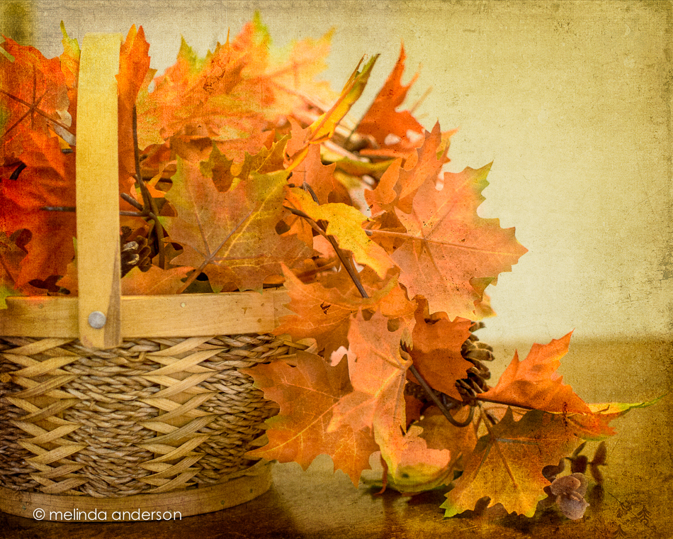 Love the warm feel of the whole image – texture and basket, and the soft orange in the leaves!