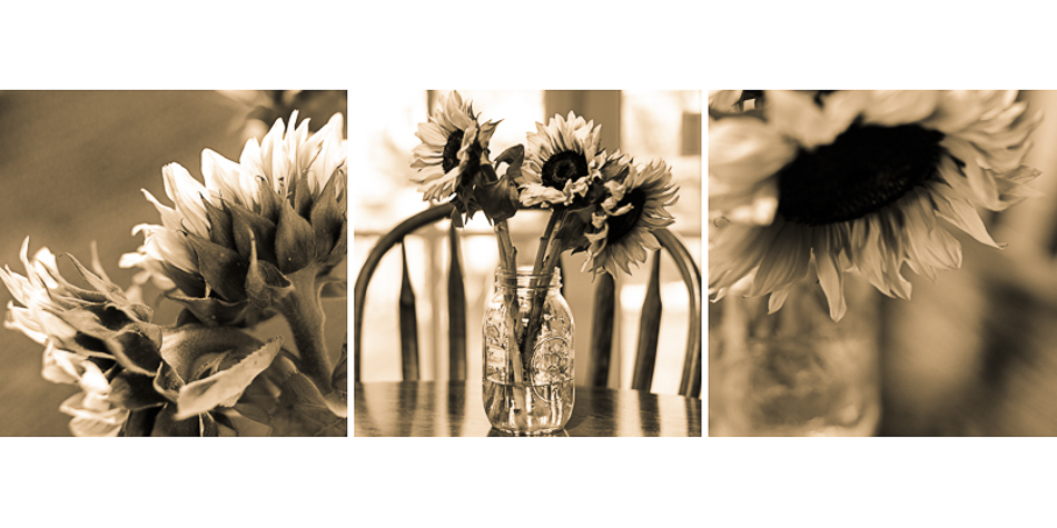 I bought sunflowers earlier in the week and didn’t photograph them.  I have sooooo many photos of sunflowers, so just couldn’t seem to compose a shot in a new way. So, I ended up doing split-toned black and white conversions- which I like- but it does seem to ignore the whole essence of sunflowers . . .