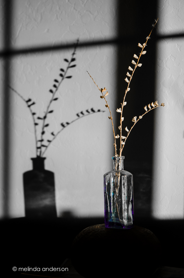 I think this just might be the last post with my dried up flowers. . . On the third day of my quest to find good light, I noticed the shadows cast on the wall by the bottle and dried flowers in my living room.  As I focused on the shadows, the camera also focused on the texture of the wall- which I didn’t want it to do.  I never completely solved this problem, but did add some texture to the image of the single bottle- which diminished the problem somewhat.