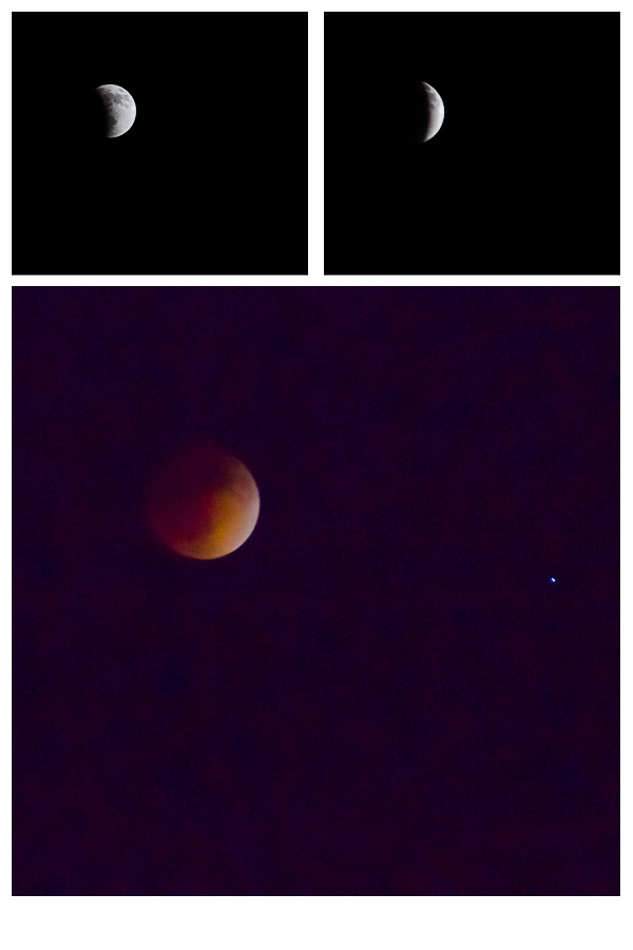 Like everyone else, I was riveted to last night’s lunar eclipse AKA blood moon.  I set up a chair in the driveway, and settled in wearing a stocking cap, gloves, warm socks, and a fleece jacket, accompanied by my camera, tripod, cable release, binoculars, flashlight, and a Lisa Gardner thriller.  It was so cold! And I was a bit concerned that a coyote ( or perhaps a scorpion) might come by.  I snapped photos every ten minutes, and was enjoying myself- but then the moon turned a beautiful orange-ish color, looking three dimensional like a painting of some distant planet. Unbelievable! I took a few (very dark) photos, but mostly just sat gazing at it until I could gaze no more.  My photos do not begin to capture what I saw.  But that’s okay.  I SAW it!