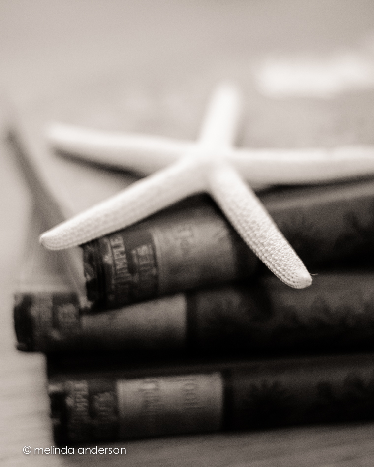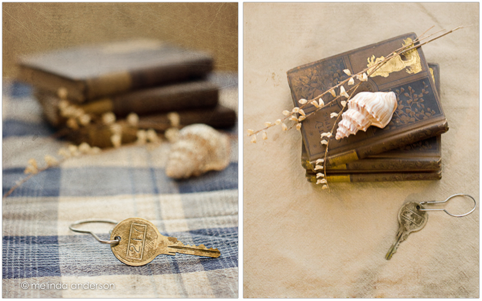 This week I can honestly say I thoroughly enjoyed doing my still lifes for Kim Klassen’s Start to Finish class. I am slowly getting into my groove, and I think it’s because I’ve been photographing some of my old books, which I dearly love. And for a little twist, I’ve added keys and shells into the mix of props. As I’ve taken my photographs over the course of the week, I found myself imagining they were book covers for books I want to read, which made it even more fun. One of the keys (which my friend, Debbie found at a garage sale) appeared to be a hotel key- for Room 217. My imagination went wild with various ideas of what the story would be that featured that key on the cover.