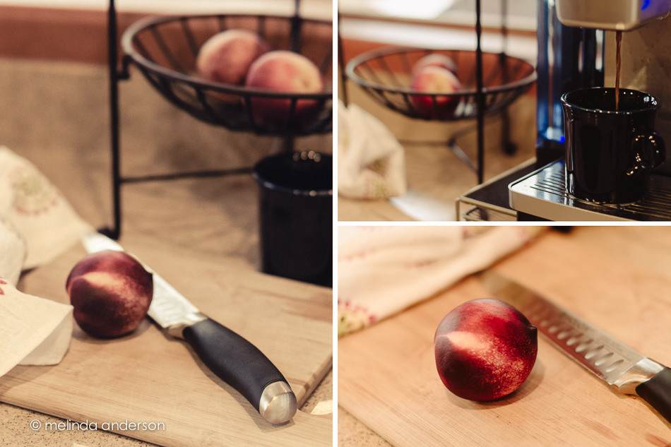 Of course, the first step was to get caffeinated, and, as the coffee started coming out of the Keurig, I grabbed my camera and took a few unstaged shots. Encouraged by how easy this was, I added a nectarine and a knife and finished the shoot in less than 10 minutes. If I had known how fast I could get it finished, I would have done it sooner!