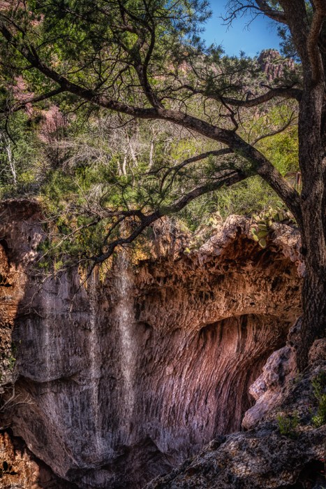 Lonnie and I took a short trip over to Payson for two nights. We had never been in the area east of the Verde Valley and wanted to explore a bit (and I wanted some photo ops!). Our first visit was to Tonto Natural Bridge State Park to view the 183 foot tall travertine arch (believed to be the highest in the world). After reading that the hike down to the bottom of the arch was strenuous and on slippery, unstable ground, we decided to save our knees and look at things from a higher vantage point- on level ground.
