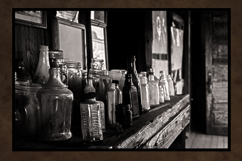 Here’s a “found still life”- old bottles on display. I don’t think there was a right angle to be found in this old ghost town- so I gave up trying to straighten anything but the door in this image!