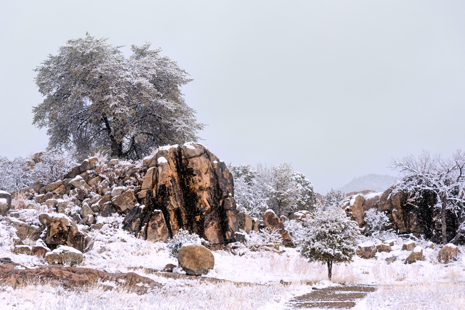 When we walked the paths at Willow Lake during our end of February snowstorm, we were amazed at how saturated the color of the rocks was in the diffused light and falling snow. Here is the view as we walked our usual path through the rocks toward the lake. Not quite Sedona- but still beautiful!
