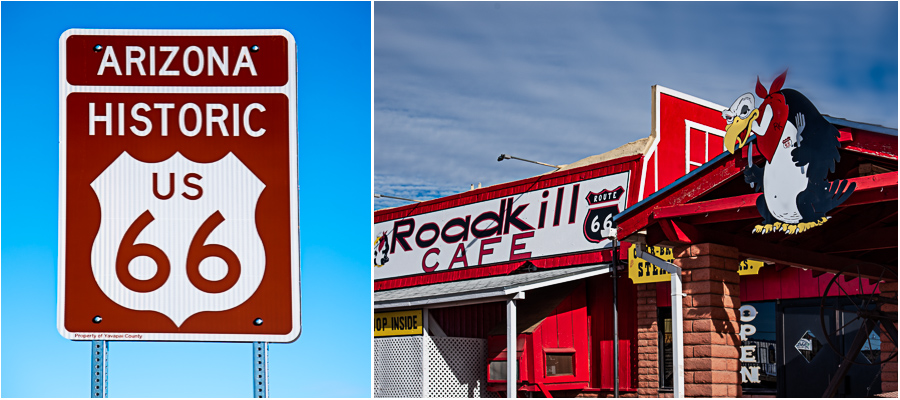 We took a drive to Seligman last weekend, a little over an hour away on America’s Main Street, the Mother Road- Route 66. Seligman celebrates its presence on Route 66 with fun and garish displays on shops and diners which attract tourists in this small and rundown little town. Perhaps its most celebrated attraction is the Roadkill Cafe. We didn’t eat there, but enjoyed walking around and taking photos.