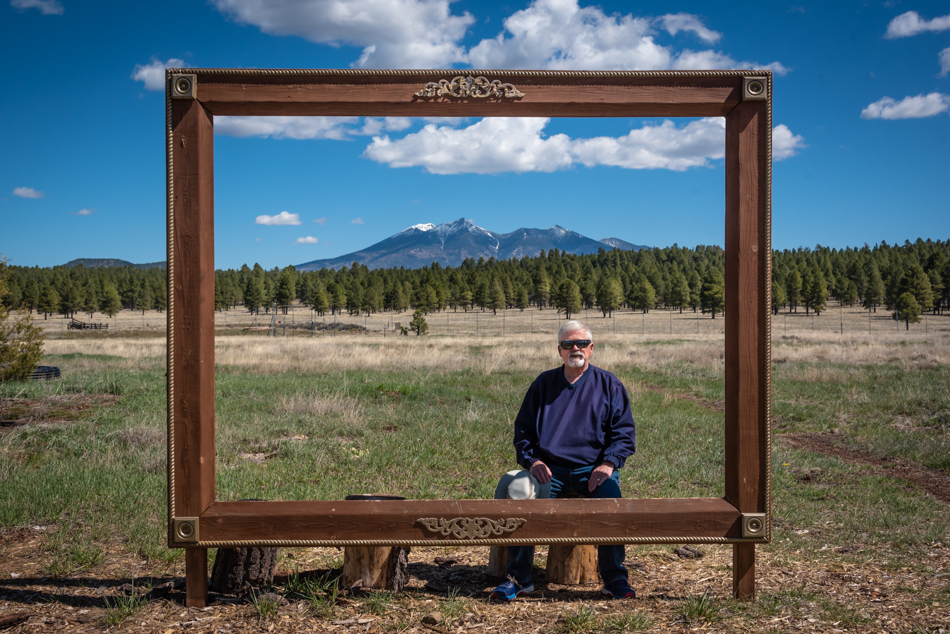 On our visit to Flagstaff last week, we spent some time at the Arboretum. It was very enjoyable (even with the busload of second graders catching tadpoles at the pond), and we especially liked the view of the San Francisco Peaks from across the meadow. A frame is set up for picture taking, and of course we couldn’t resist taking photos of each other with the peaks behind.