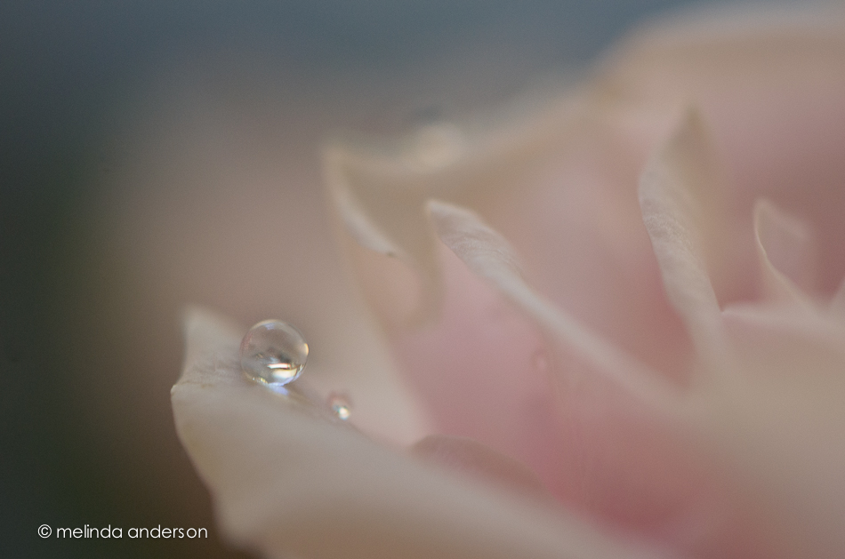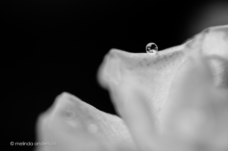 Here is a bonus photo from yesterday. Yesterday morning, I only looked at the last two shots I took of the waterdrop on the flower, because that’s when I used the tripod. When I went on the computer last night, I discovered that the first (handheld!) shots were actually clearer. In this shot, I am reflected in the drop. I did a black and white conversion just because. . .