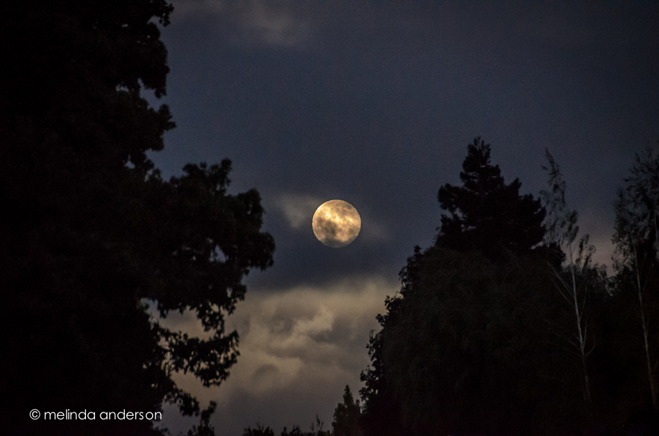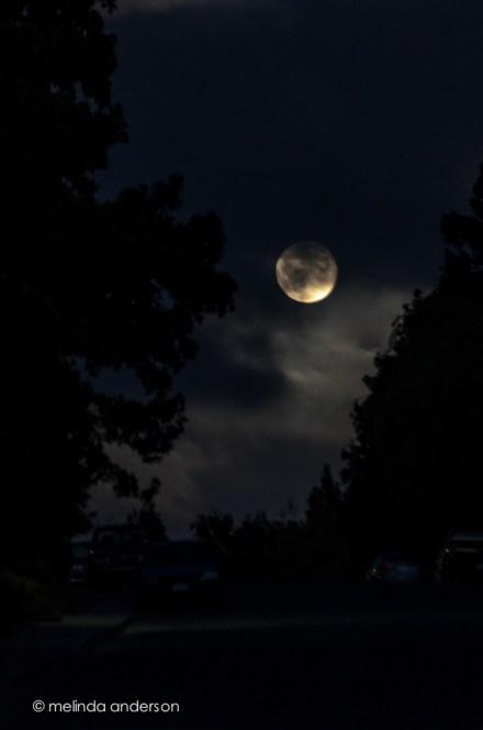 We drove home, and I grabbed my camera and quickly walked back to to where we had the fantastic view. The moon had already risen, and did not appear nearly as large as it had five minutes earlier. To make matters worse, it was heading into a thick bank of clouds. I didn’t have time for manual settings, so basically clicked 3 times before the moon completely disappeared. I guess I should have chosen Program Mode, which I almost never use. The first shot (in Aperture Priority) had a shutter speed of 1/8 second! – and ISO 200. You can see a bit of the trees and cars on the street. For the next one, I hurriedly set my dial to my custom user setting, which includes Auto ISO- and the ISO shot up to 6400! The shutter speed was 1/20. Ridiculous settings- I might as well have used my phone! These shots won’t win any prizes, but they captured a moment!