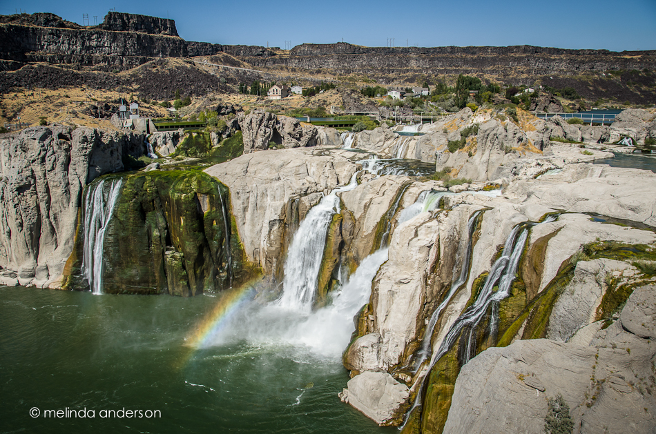 And here are the beautiful Shoshone Falls (evidently less beautiful than usual, because the water is low). I tried the slow shutter speed, silky water thing, but it was just too sunny without a polarizer. I also did some panorama shots, but haven’t had time to see how they worked out. But look at that rainbow!