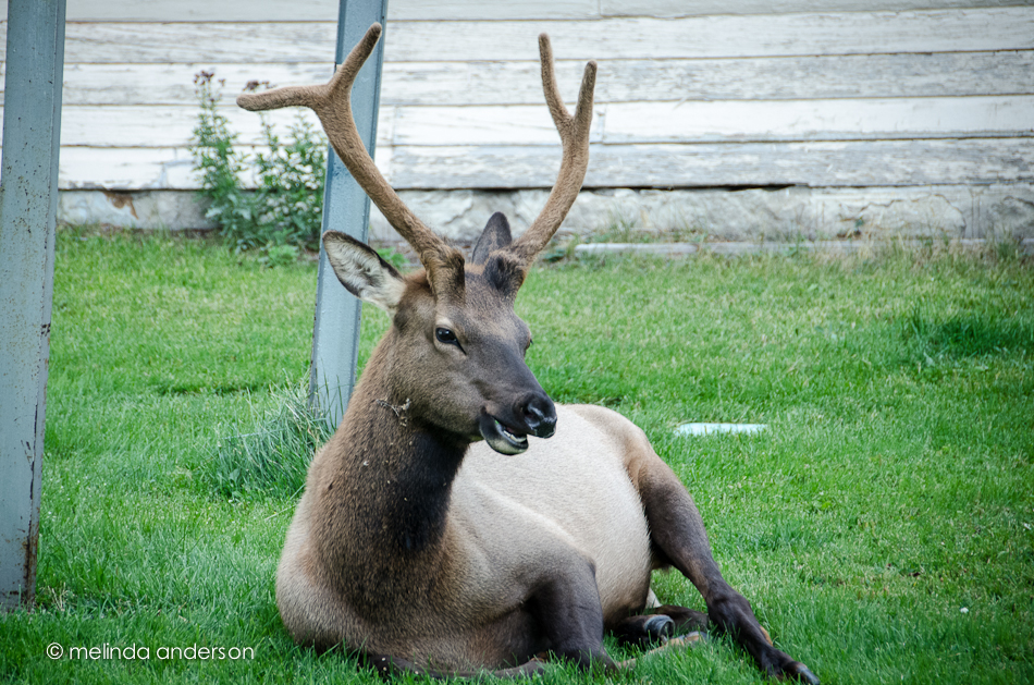 And, to prove that we are at Yellowstone, here is a young male elk making himself at home on the lawn.
