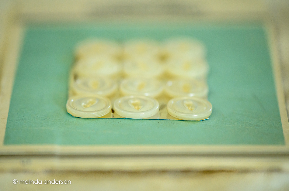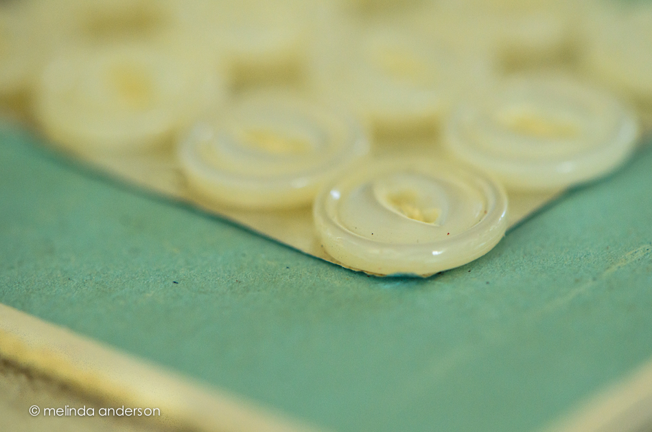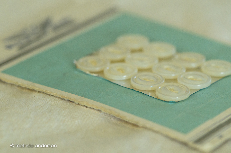 This is the last day for the button theme in my Flickr group, so I searched through my grandmother’s sewing kit to find this card of tiny white buttons.